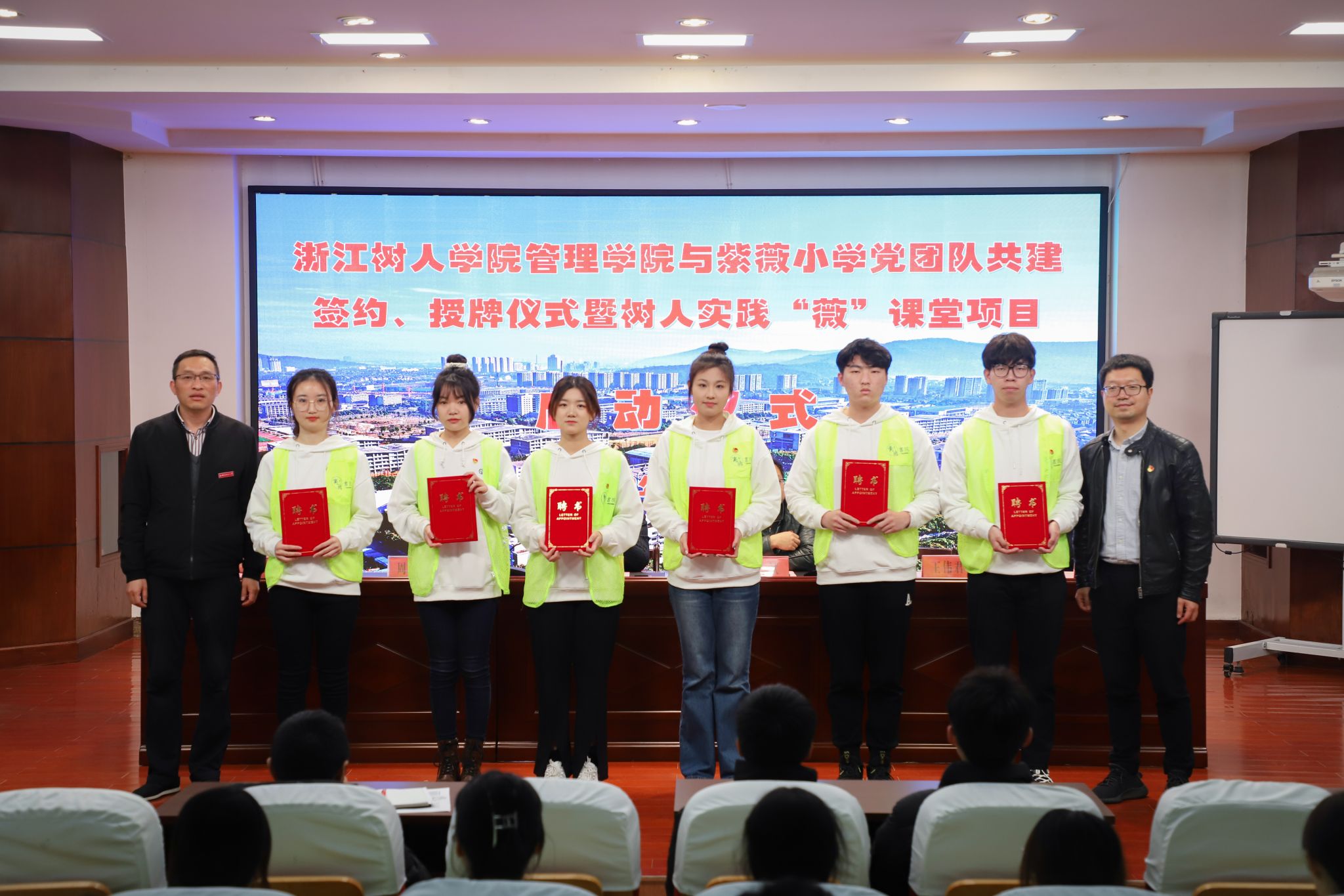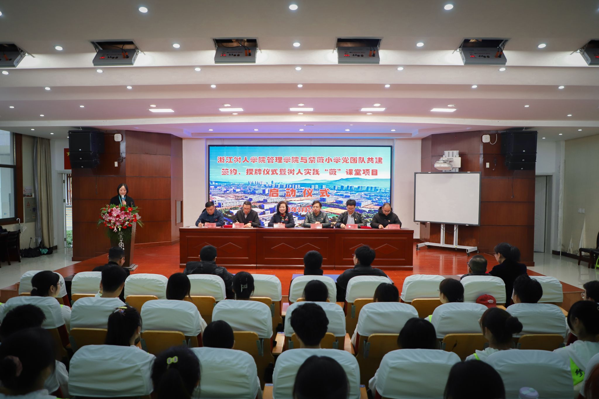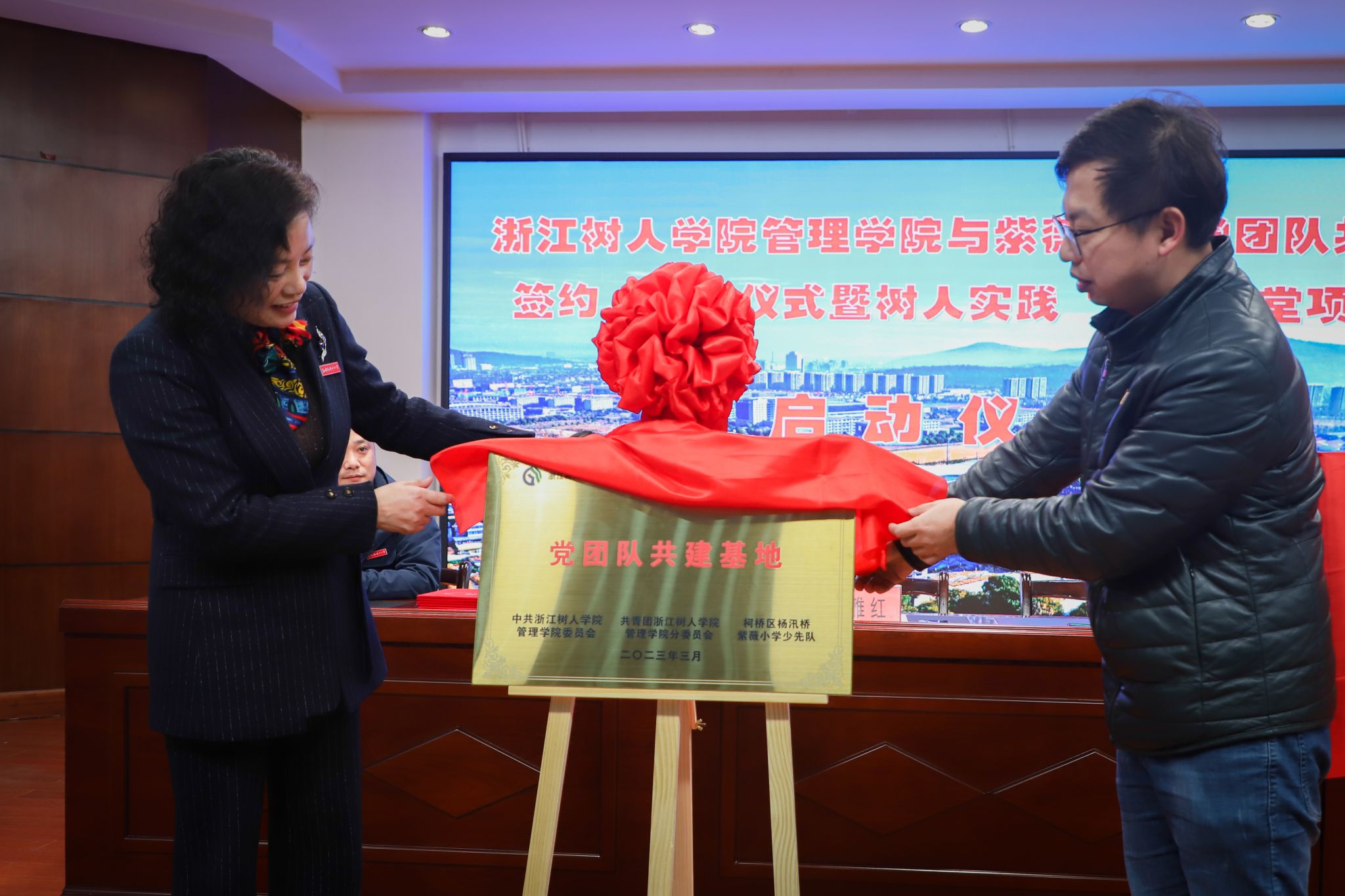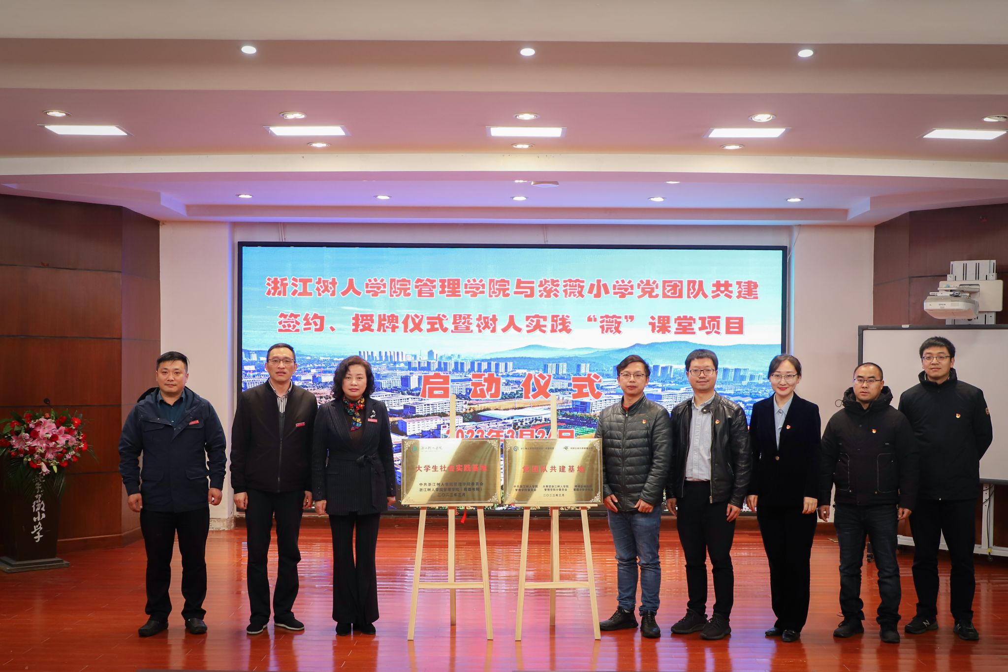 为深入贯彻落实党的二十大精神,着力推动党、团、队育人链条相衔接、相贯通,努力培养德智体美劳全面发展的社会主义建设者和接班人,3月24日下午,今年会管理学院与柯桥区杨汛桥紫薇小学在紫薇小学报告厅隆重举行党团队共建签约、授牌仪式暨树人实践“薇”课堂项目启动仪式。管理学院党委副书记曹斌、书院副院长兼党委副书记王伟君、紫薇小学校长李雅红、副校长张明、周国标出席签约仪式。紫薇小学所有中层领导、教师代表、学生代表及管理学院教师代表、志愿者代表等参加仪式,共同见证基地揭牌。