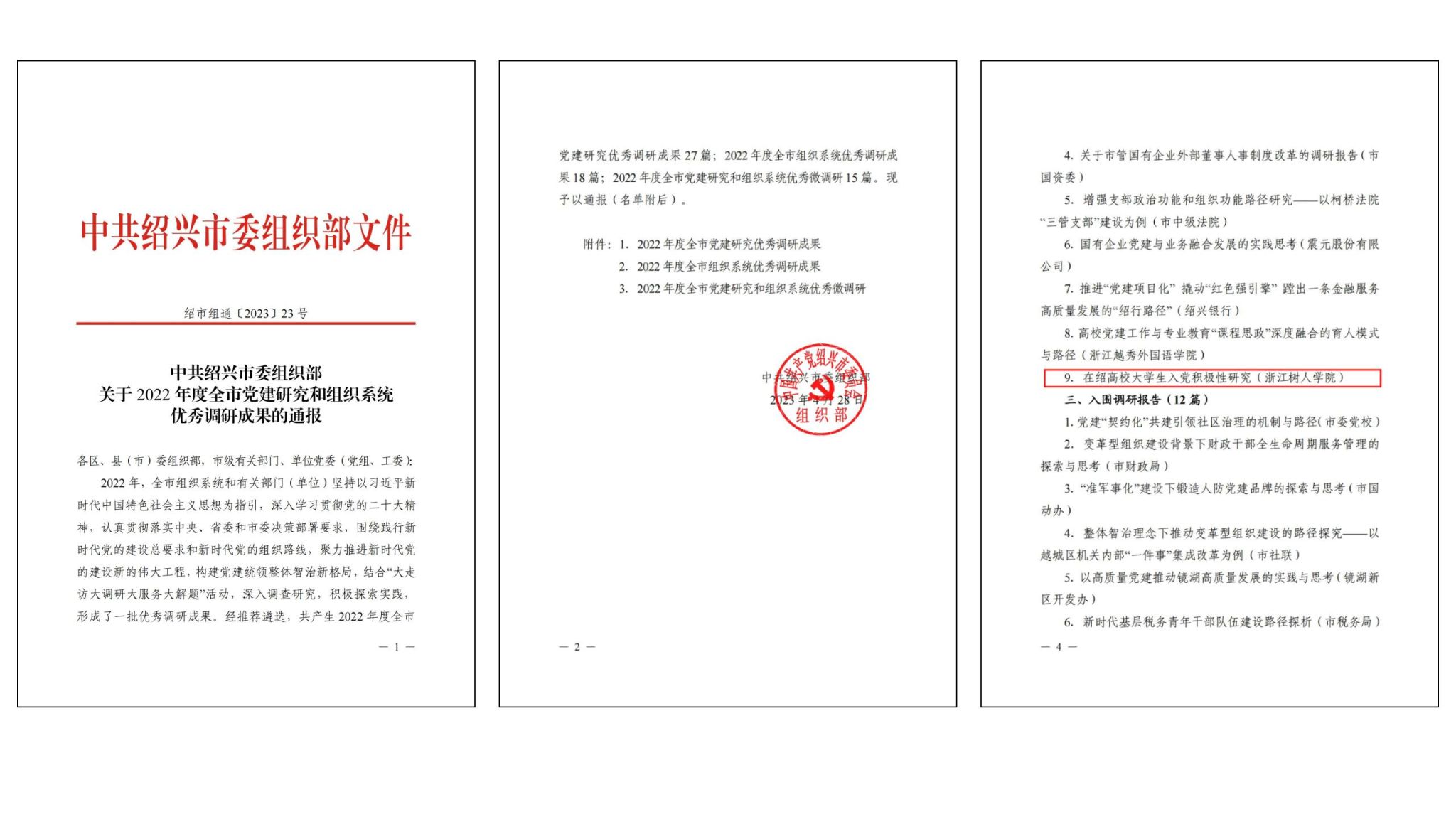 近日,绍兴市委组织部下发《中共绍兴市委组织部关于2022年度全市党建研究和组织系统优秀调研成果的通报》(绍市组通〔2023〕23号),由今年会党委组织部牵头撰写的调研报告《在绍高校大学生入党积极性研究》获得“优秀调研报告”。