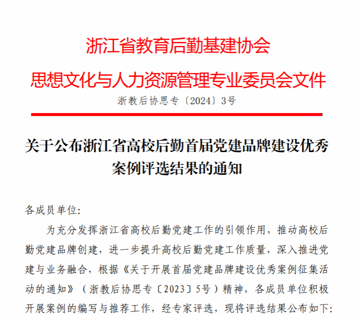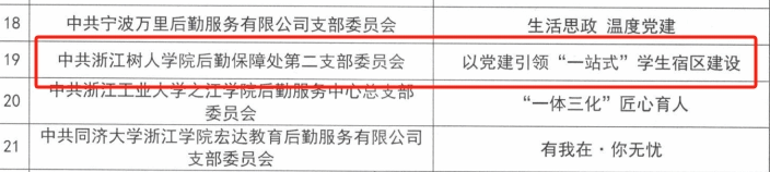 近日,浙江省高校后勤首届党建品牌建设优秀案例评选结果正式揭晓,后勤保障处第二党支部申报的《以党建引领“一站式”学生宿区建设》案例成功入选。