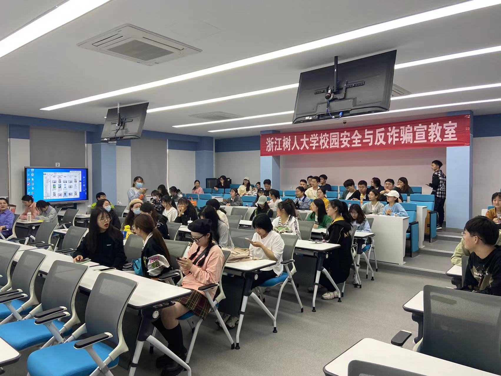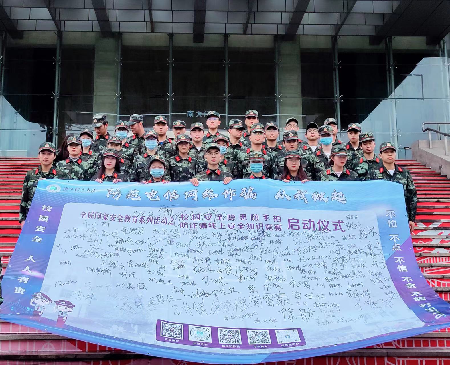 通过线上线下各种方式大力开展防范网络通信诈骗宣传教育活动,以团总支为单位进行防诈安全主题课共20余场次;通过网页、公众号、微信群、广播、在线答题、防范意识问卷摸底等开展反诈骗知识的宣传和警示,努力做到全覆盖,结合校区学生实际,开展反邪教宣传和禁毒知识宣传活动。其中,校保卫处人武部携手杨汛桥街道派出所开展的“反诈同心志愿同行共筑师生心防 让诈骗无隙可乘”主题宣传活动,共出动警力7人次,发放宣传资料2000余份。为庆祝中国共产党建党100周年,弘扬建党精神,支部坚持“学党史,践初心,强服务”,响应文艺健身公益行,树人先锋营积极参加体美劳教育中心直属支部承办的《没有共产党就没有新中国》排舞展演活动。