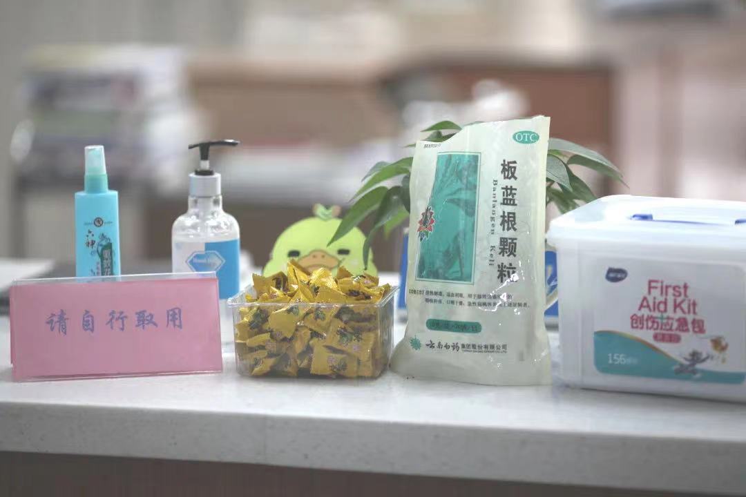 一是设置“服务小站”。配备板蓝根、碘酒、创可贴、接线板、订书机、纸、笔等医用物品和文具,花露水、针线包、雨伞应有尽有,同学们可按需自取。