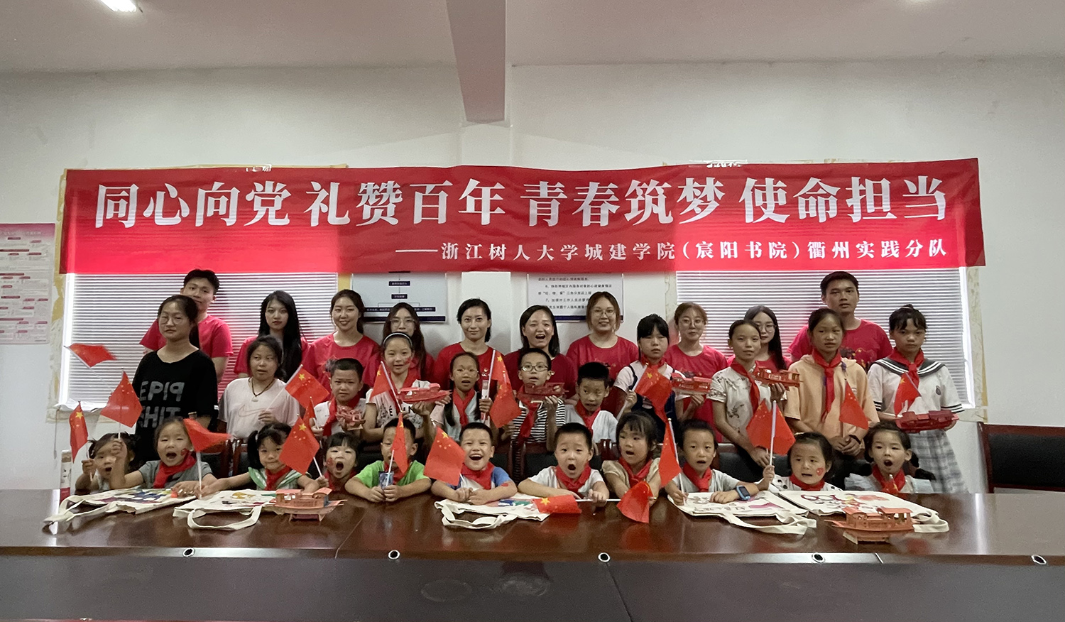 在田畈村村委会的协助下,实践团师生们组织田畈村小学生在党群服务中心开展了一场丰富多彩的党史宣传与教育活动。亲切可爱的相兰老师生动地讲述了少先队和红领巾的故事;实践团师生们为孩子们系上红领巾,指导他们制作南湖红船模型和绘制喜庆建党百年的帆布袋;最后,小学生们挥舞着国旗合唱《少年先锋队队歌》,铿锵有力的歌声将活动的氛围推向最高潮。“为着理想勇敢前进,我们是共产主义接班人。”孩子们嘹亮的歌声,表达了他们纯真又强烈的对党的忠诚与热爱之情。