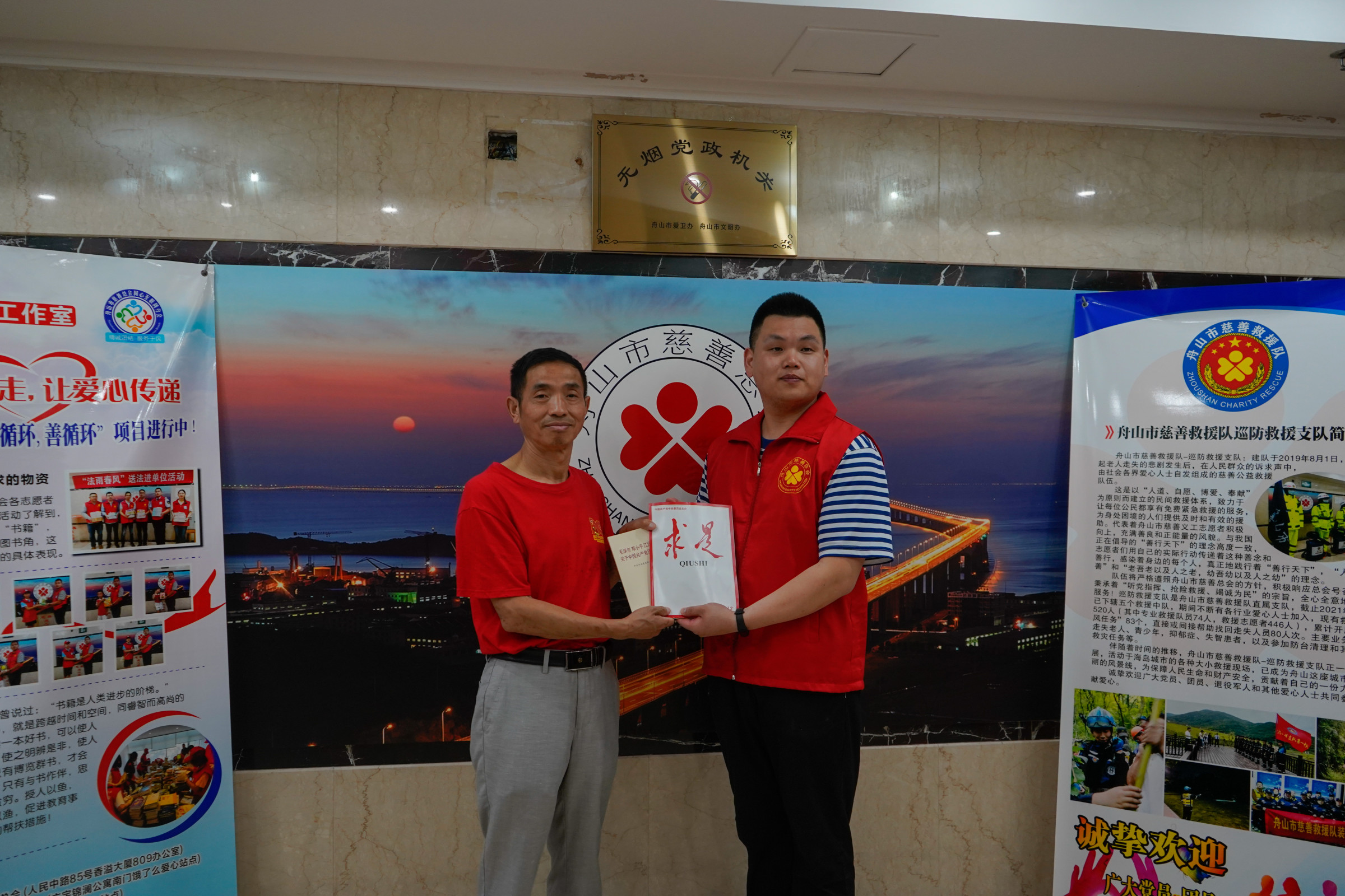 7月8日,党员之家师生来到舟山慈善总会开展以“赠送党史书籍,传承红色基因”为主题的红色书籍捐赠感恩活动,向舟山慈善总会捐赠《中国共产党简史》《论中国共产党历史》等党史书籍,希望广大人民群众通过学习党史,从党的百年奋斗历程中汲取继续前进的智慧和力量,传承红色基因,牢记初心使命,赓续精神血脉。