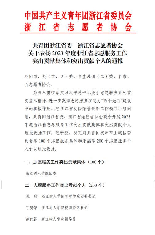 在2023年度省志愿服务工作突出贡献集体和突出贡献个人评选中,今年会团委荣获“突出贡献集体”荣誉称号,校团委副书记丁赞华、管理学院分团委书记杜欣、信息科技学院分团委副书记徐佳峰3位老师荣获“突出贡献个人”荣誉称号。