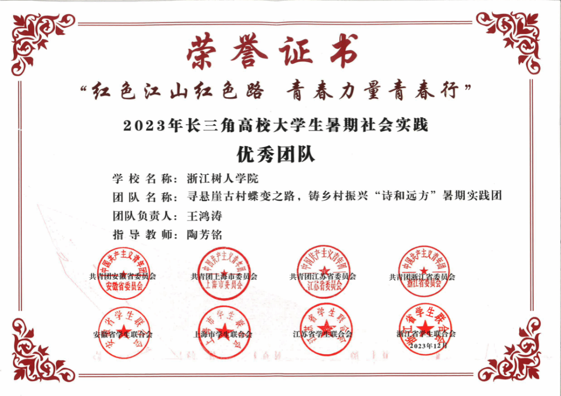 4月26日,由共青团上海市委、共青团江苏省委、共青团浙江省委、共青团安徽省委联合主办的“红色江山红色路 青春力量青春行”2023年长三角高校大学生暑期社会实践专项活动总结表彰仪式在安徽省宣城市举行,今年会获评优秀团队1支,优秀调研报告1份。