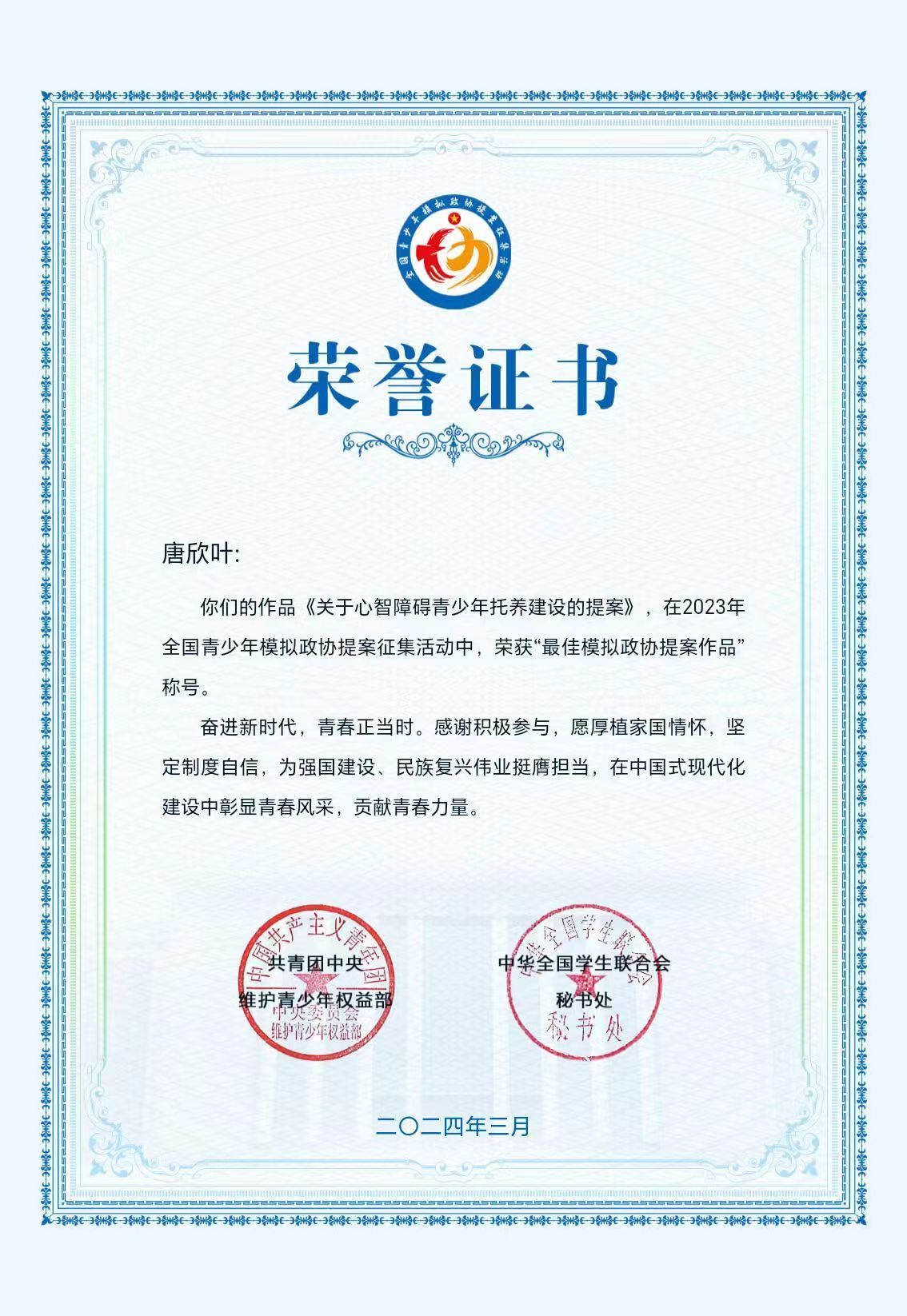由共青团中央维护青少年权益部、中华全国学生联合会秘书处联合开展的2023年全国青少年模拟政协提案征集活动最终评审结果公布。今年会学生的提案作品《关于心智障碍青少年托养建设的提案》(学生:唐欣叶;指导教师:任思璇、高秀苹)从众多作品中脱颖而出荣获大学组“最佳模拟政协提案作品”称号。