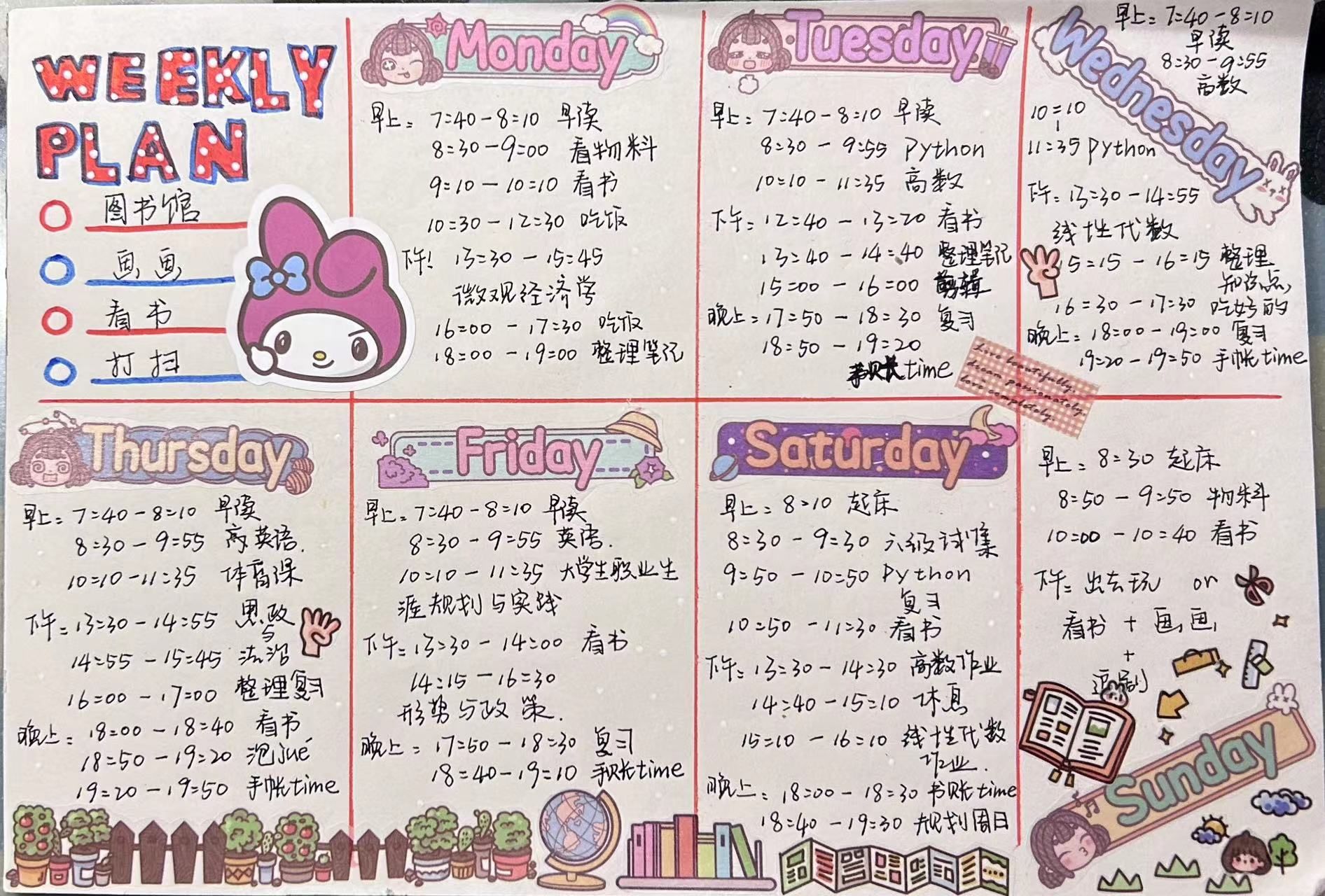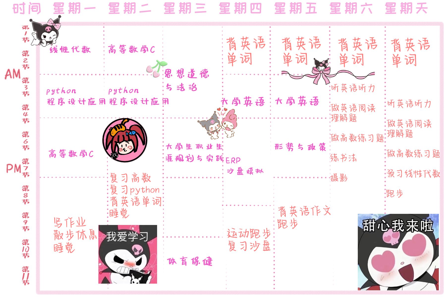 作息表可以让我的生活变得有秩序,不至于会有零散时间因为没有安排而浑浑噩噩的过去。劳逸结合,不知不觉提高自己的学习效率,也会让每天完成“任务”的自己收获感满满。靠每天高质量完成计划,减少没必要的焦虑,还可以培养自己的时间观以及克服拖延症,让自己更专注。