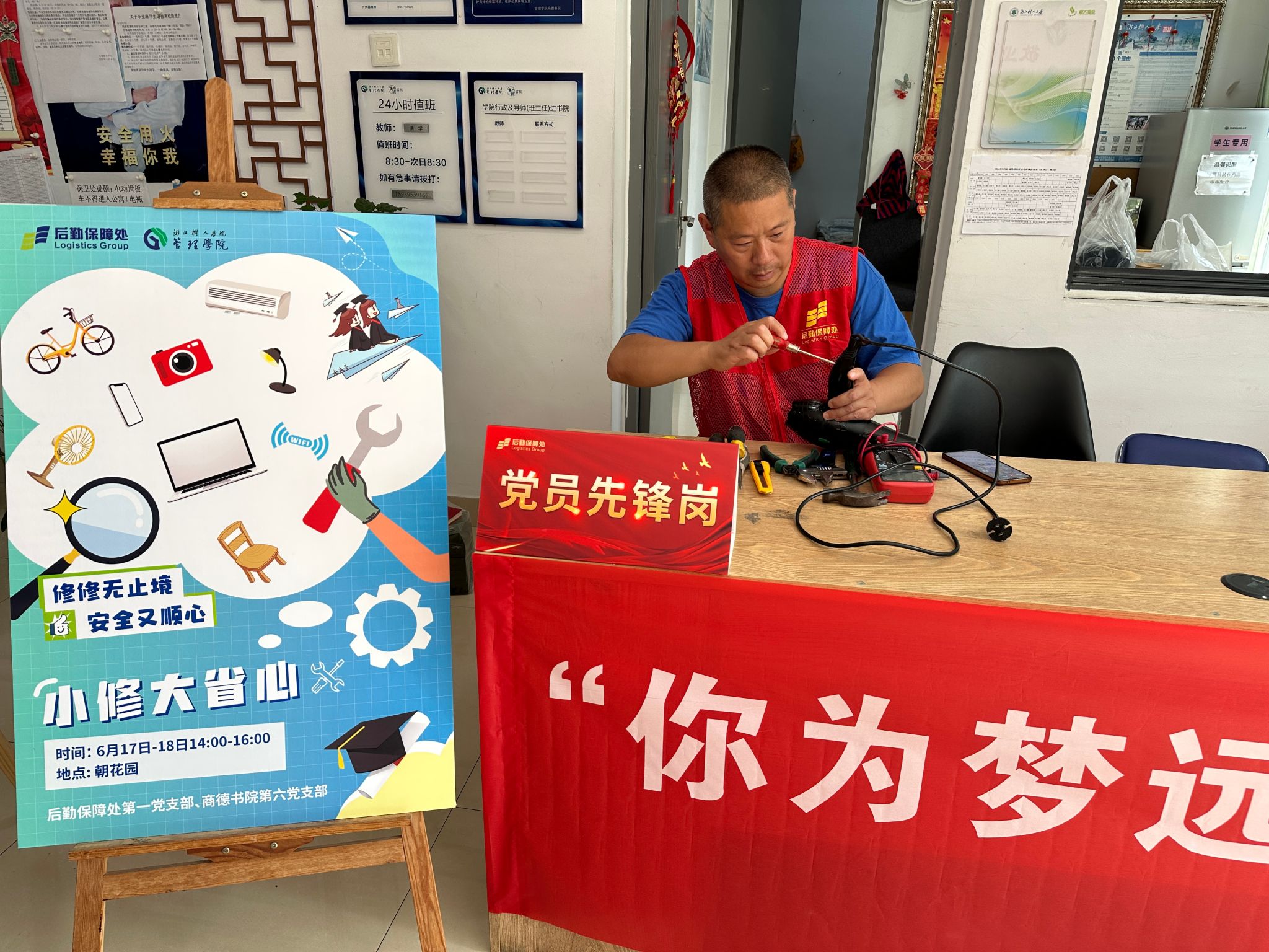 “小修大省心,最后一堂育人课”。第一党支部的维修师傅走进书院,为毕业生们现场提供各类维修服务。不同的工具在手中不断切换,通过拆卸、测量、更换配件、调试,一件件坏掉的小物品经过师傅的“诊治”,又焕发出了新的生机,在维修过程中也会为毕业生们普及安全用电和电器保养相关知识,希望在毕业后没有“半小时响应”的校园维修师傅了,也能动手解决生活中出现的简单维修问题。