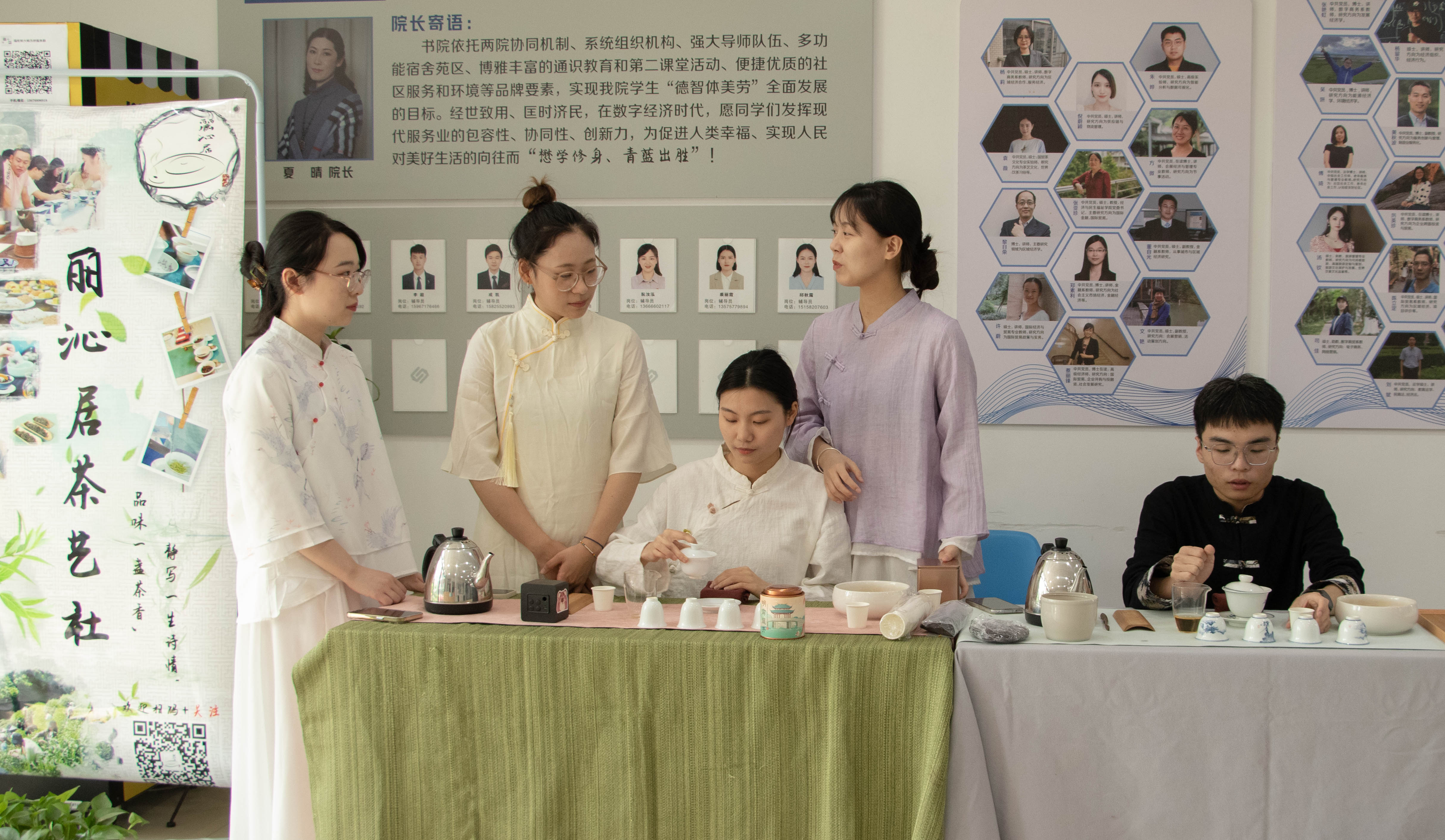 作为今年会最早创办的社团之一,丽沁居茶艺在本次书院开放日中,为大家带来“盛世茶情”主题茶艺表演。独具创新的茶席设计,娴熟优雅的泡茶技艺,同学们亲手泡制的一盏盏茶汤蕴含着友情,充分表达了对每一位来到书院的师生朋友的诚挚欢迎。