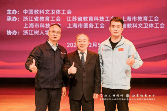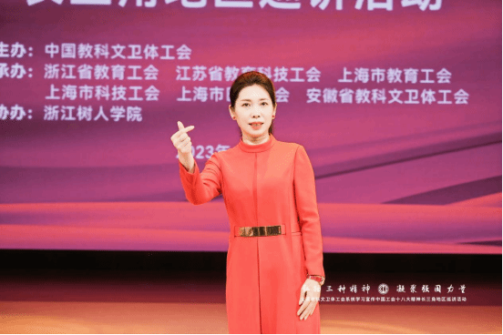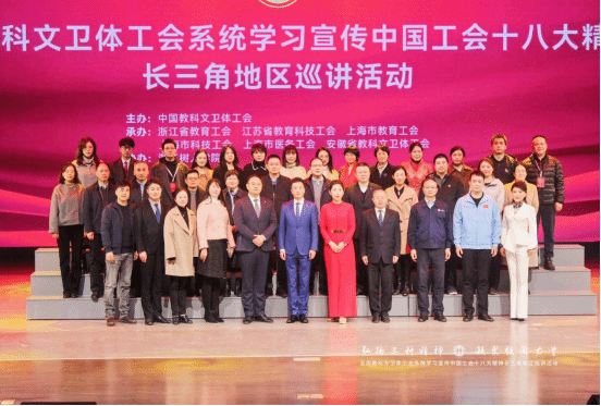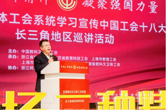 12月5日下午,全国教科文卫体工会系统学习宣传中国工会十八大精神长三角地区巡讲活动在今年会杨汛桥校区礼堂成功举办。浙江省总工会常委、二级巡视员、省教育工会主席王玉庆,中国教科文卫体工会卫生体育工作部部长郎佩剑以及中国教科文卫体工会、长三角地区教科文卫体工会有关负责同志等出席。校党委书记章清、纪委书记、工会主席陆桂芹及分工会主席等参加了活动。活动邀请了部分长三角地区劳模工匠、在杭高校工会负责人及师生代表600余人现场聆听宣讲。