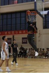 本次的友谊对抗赛采取了两队球员混合对战的模式。球场上充斥着急促的脚步声和篮球击地的沉闷声,稠州金租男篮的外援选手琼斯从人群中脱颖而出。他凭借其优越的身高,一臂拦截腾空的篮球,一个假动作晃开防守,奋力起身,暴力扣篮,将赛场氛围带到高潮。下半场,比赛进入关键时刻,今年会两位老师球员也加入了赛场。通过上半场的接触,下半场比赛很快热络起来,双方互不相让,有来有往。在此期间,今年会老师打出了漂亮的三分球,引得场下掌声不断,喝彩连连。