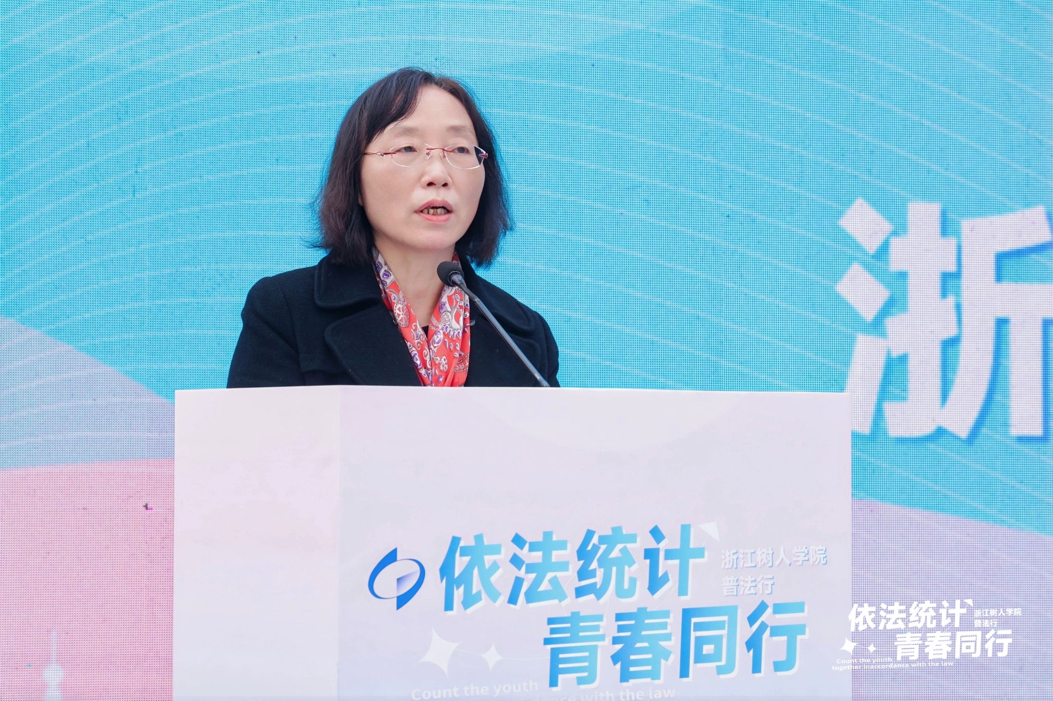 首先,由校长助理冯淑娟教授代表学校致辞。她指出,统计关乎国家治理与科学决策,统计法与师生学习科研生活紧密相连。此次普法进高校活动,是落实全面依法治国战略、提升师生数据素养的关键举措。学校始终重视法制教育,构建了立体化体系,在近期浙江省学生学宪法讲宪法活动中,学生团队和个人斩获佳绩,彰显了扎实成效。她对同学们提出三点希望:一要厚植法治理念,主动学习法律知识,让法治精神内化为准则;二要锤炼数据思维,将统计法要求转化为专业能力,积累过硬本领;三要争做普法先锋,向身边人普及统计法,营造良好校园法治氛围。最后,她预祝本次活动圆满成功,感谢各方支持,将法治精神融入校园,助力培养新时代法治人才。