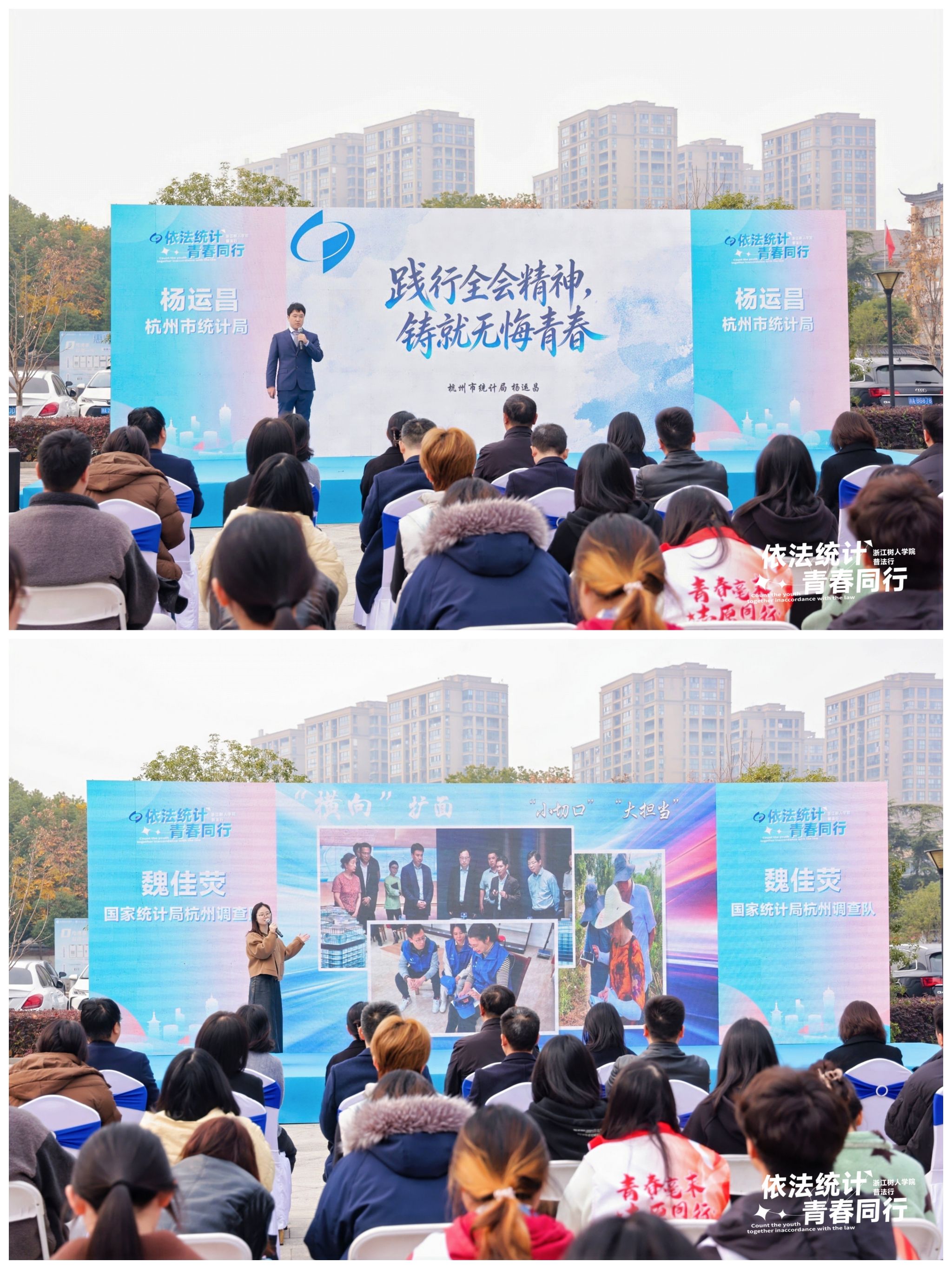 来自统计工作一线的青年宣讲员,杨运昌博士以“践行全会精神,铸就无悔精神”为题、国家统计局杭州调查队的魏佳荧以“以不变之城,应万变之数”为题,从专业的视角用生动的语言诠释统计法治的时代内涵。分享他们对统计工作的理解与感悟。