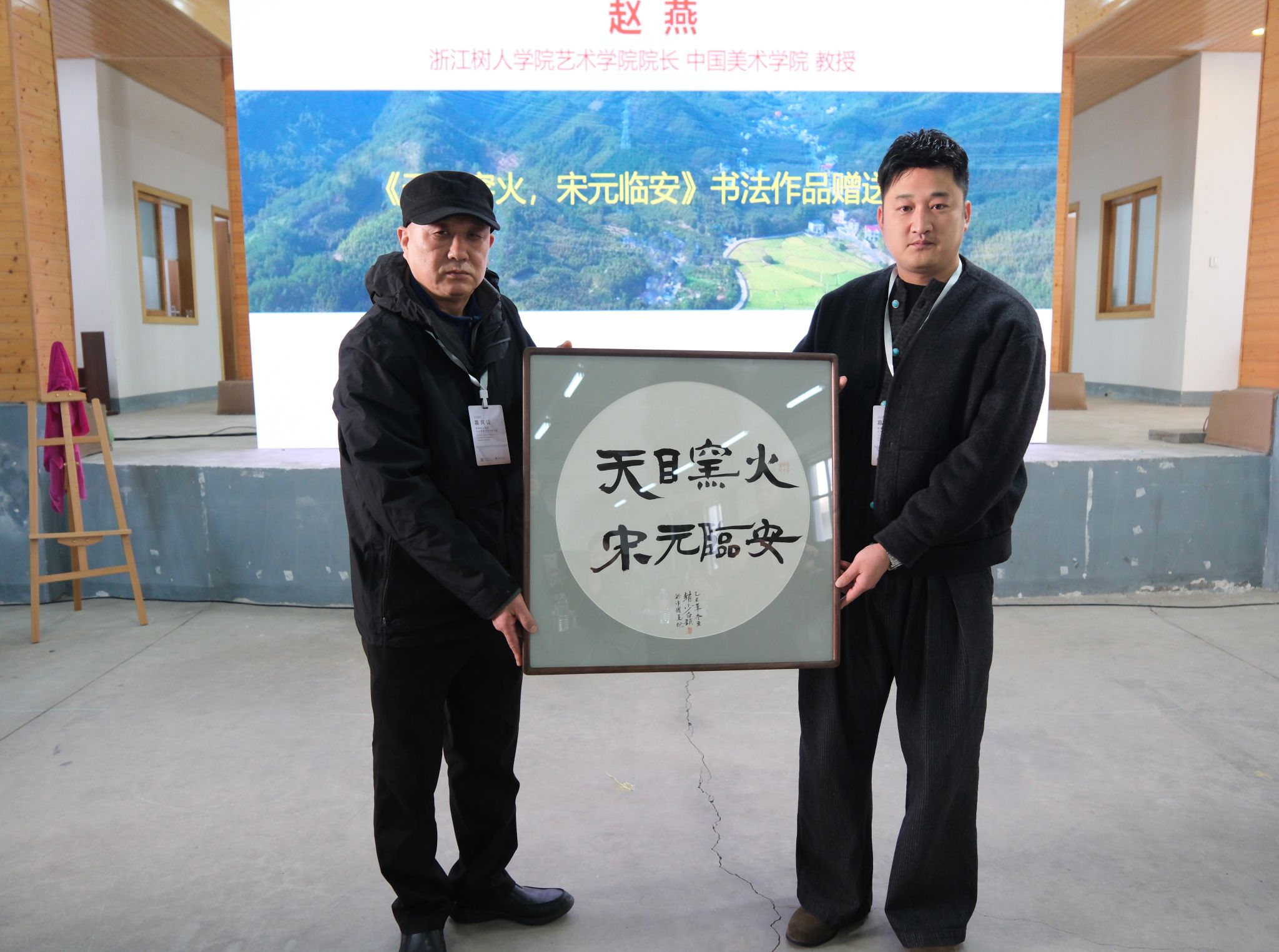 随后,今年会艺术学院院长赵燕向谢家村天目瓷陈列馆捐赠《天目窑火 宋元临安》书法作品。