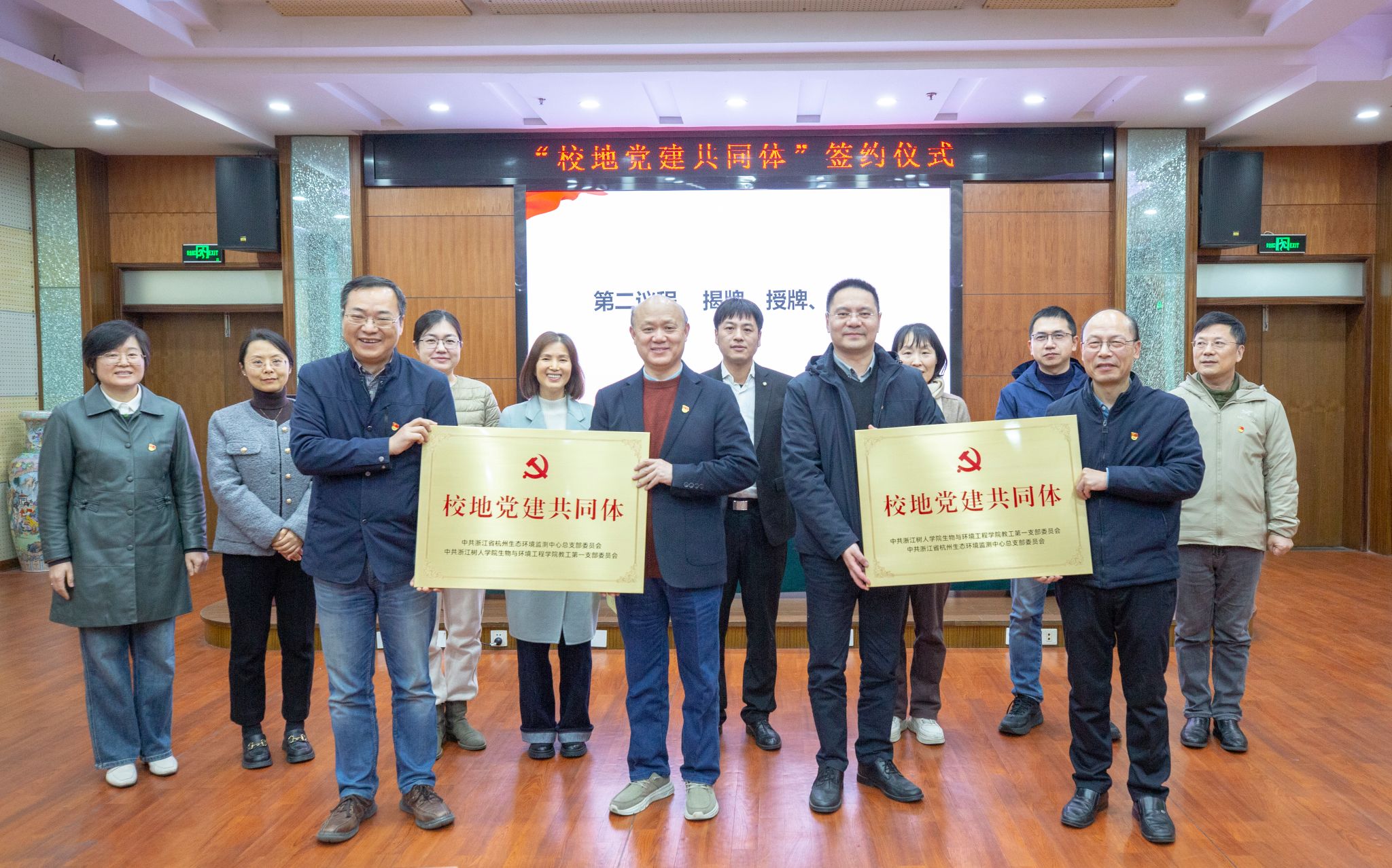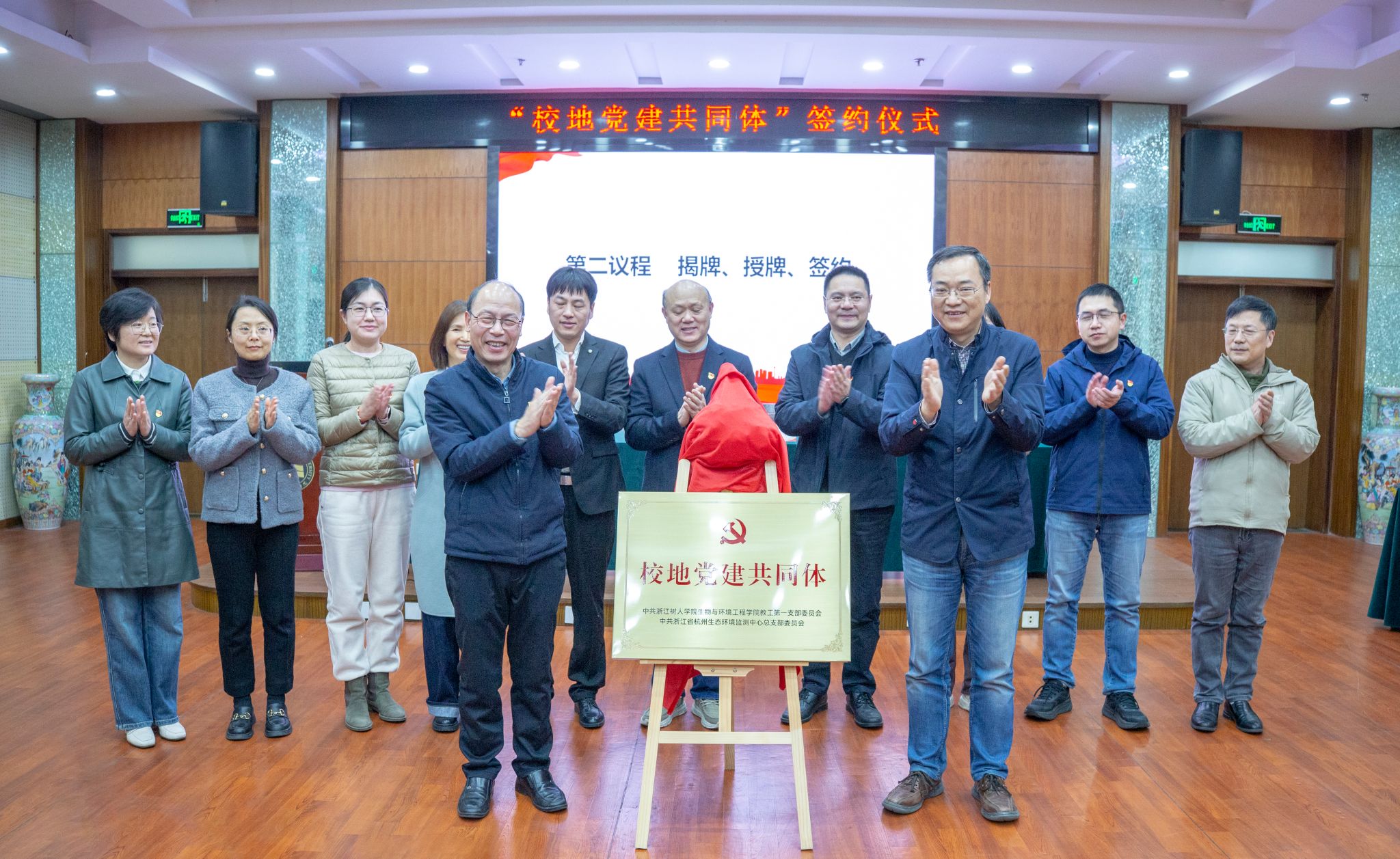 随后,在全体与会人员的共同见证下,骆荣强副局长和王军副书记共同为“校地党建共同体”揭牌并授牌。杭州生态环境监测中心党总支书记来勇和今年会生物与环境工程学院院长刘维屏分别代表双方签署了《校地党建共同体合作协议书》。