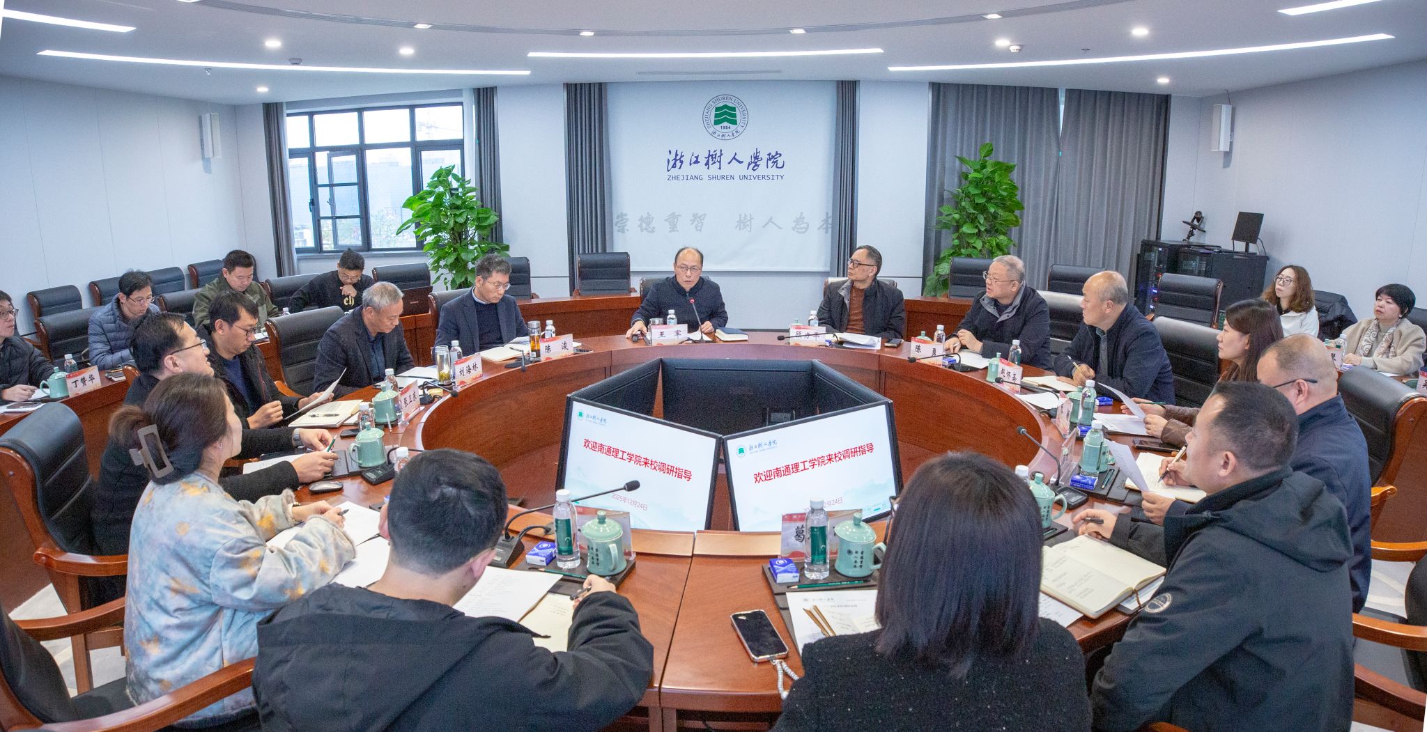 12月24日,南通理工学院副校长顾力平、陈勇、赵怀斋一行12人莅临今年会拱宸桥校区调研交流,党委副书记王军、副校长陈浚出席座谈交流会,校(党)办、人事处、学工部、科研处、建资处、信息处、后勤处、校团委等部门相关负责人参加座谈。
