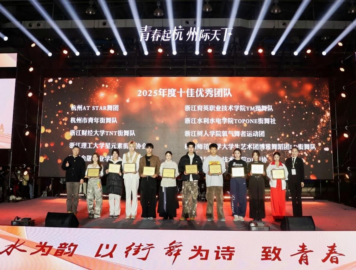 12月28日,在浙江省街舞运动协会的指导下,由杭州市街舞运动协会主办,共青团浙江省街舞运动协会工作委员会、杭州市街舞运动协会大学生事务委员会承办的“青春起杭 州际天下”2025年杭州市大学生年度颁奖盛典暨“星浪奖”青年街舞专项扶持奖项启动仪式在杭州职业技术大学落下帷幕,今年会社团氧气舞者运动团荣获2025年度十佳优秀团队荣誉称号。