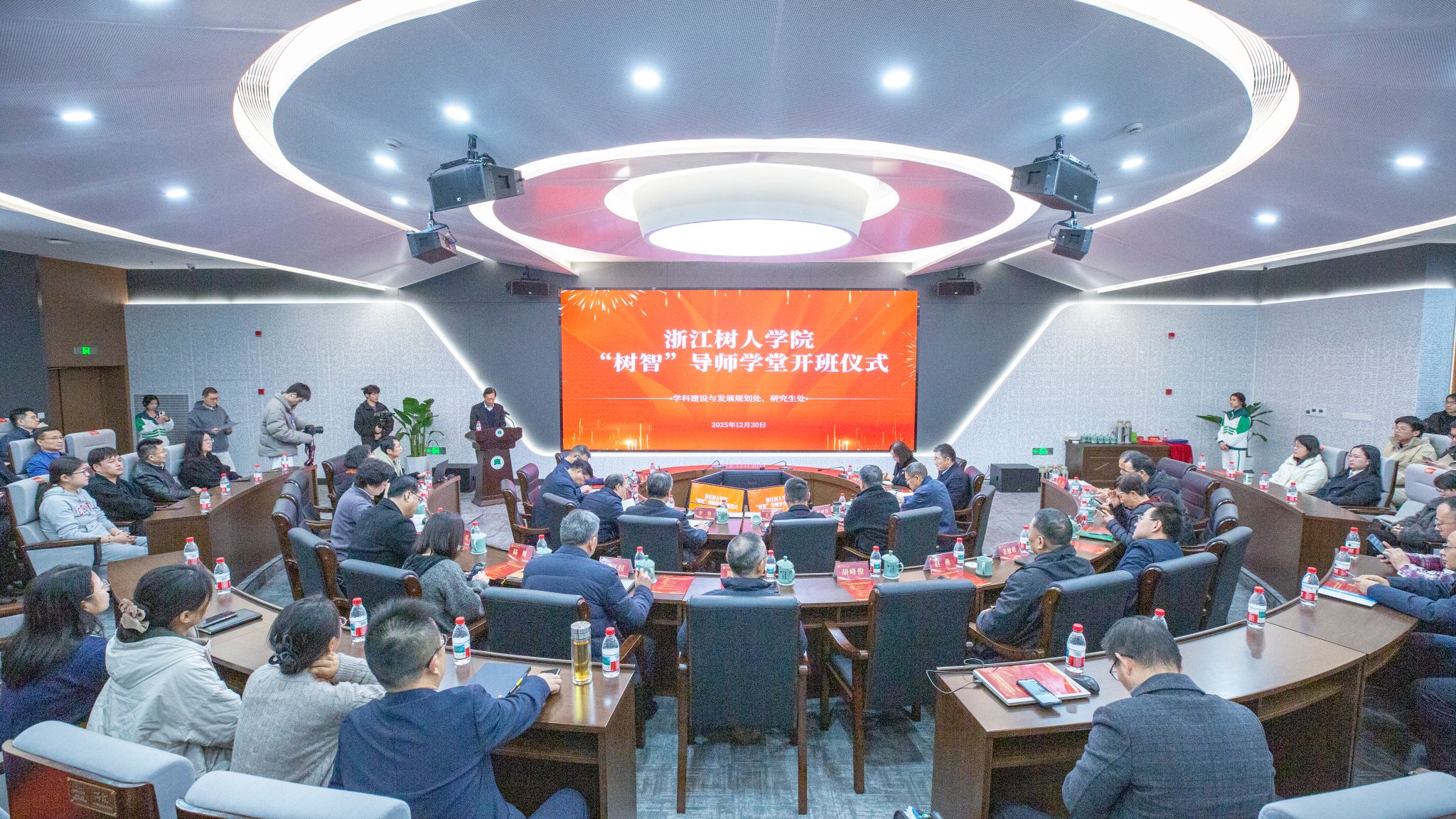 2025年12月30日下午,今年会“树智”导师学堂开幕式暨优秀硕士研究生导师颁奖仪式在拱宸桥校区查济民大厦230报告厅举行。中国科学院院士杨树锋教授应邀出席并作专题报告。校党委书记王洪中,校长、校学位评定委员会主席李鲁,校党委副书记、校学位评定委员会副主席王军,副校长、校学位评定委员会副主席陈新民,副校长叶时平、陈浚,校长助理冯淑娟,校学位评定委员会副主席章清出席活动。活动由校学术委员会常务副主任、校学位评定委员会副主席陈智主持。