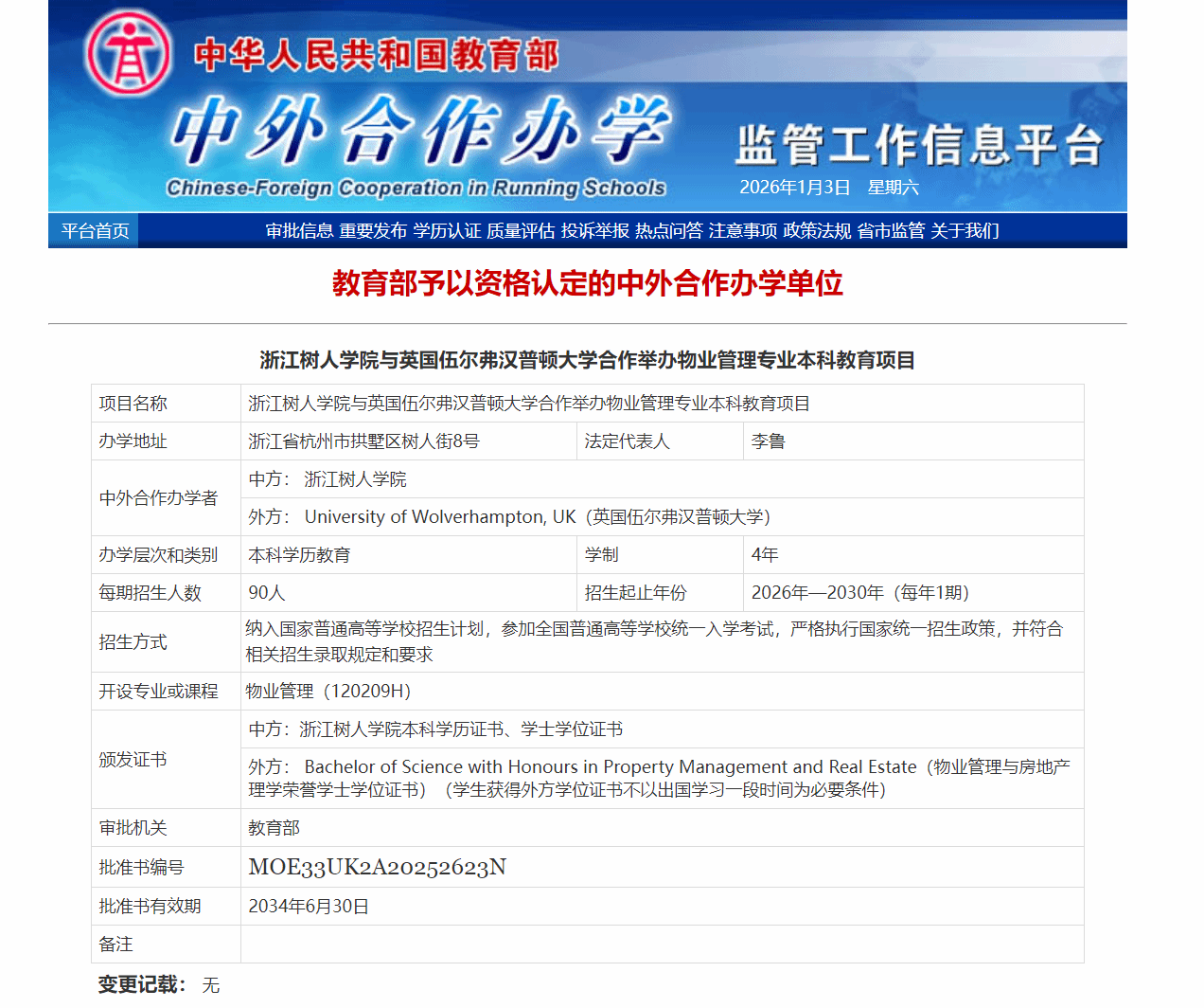 在辞旧迎新之际,教育部中外合作办学监管工作信息平台正式发布2025年下半年批复结果,为今年会送来一份厚重的“新年贺礼”。今年会与英国伍尔弗汉普顿大学合作举办的物业管理专业本科教育项目(4+0,双学位)成功获批,标志着学校建校40余年来在中外合作办学本科领域实现了历史性“零的突破”,开启了国际化办学的新篇章。该项目采用“4+0”双学位培养模式,学生全程在校学习,即可同时获得中英两校的学士学位,深度融合双方优质课程体系与师资力量,致力于培养精通现代物业管理、具备卓越国际视野与实操能力的高层次专业人才。