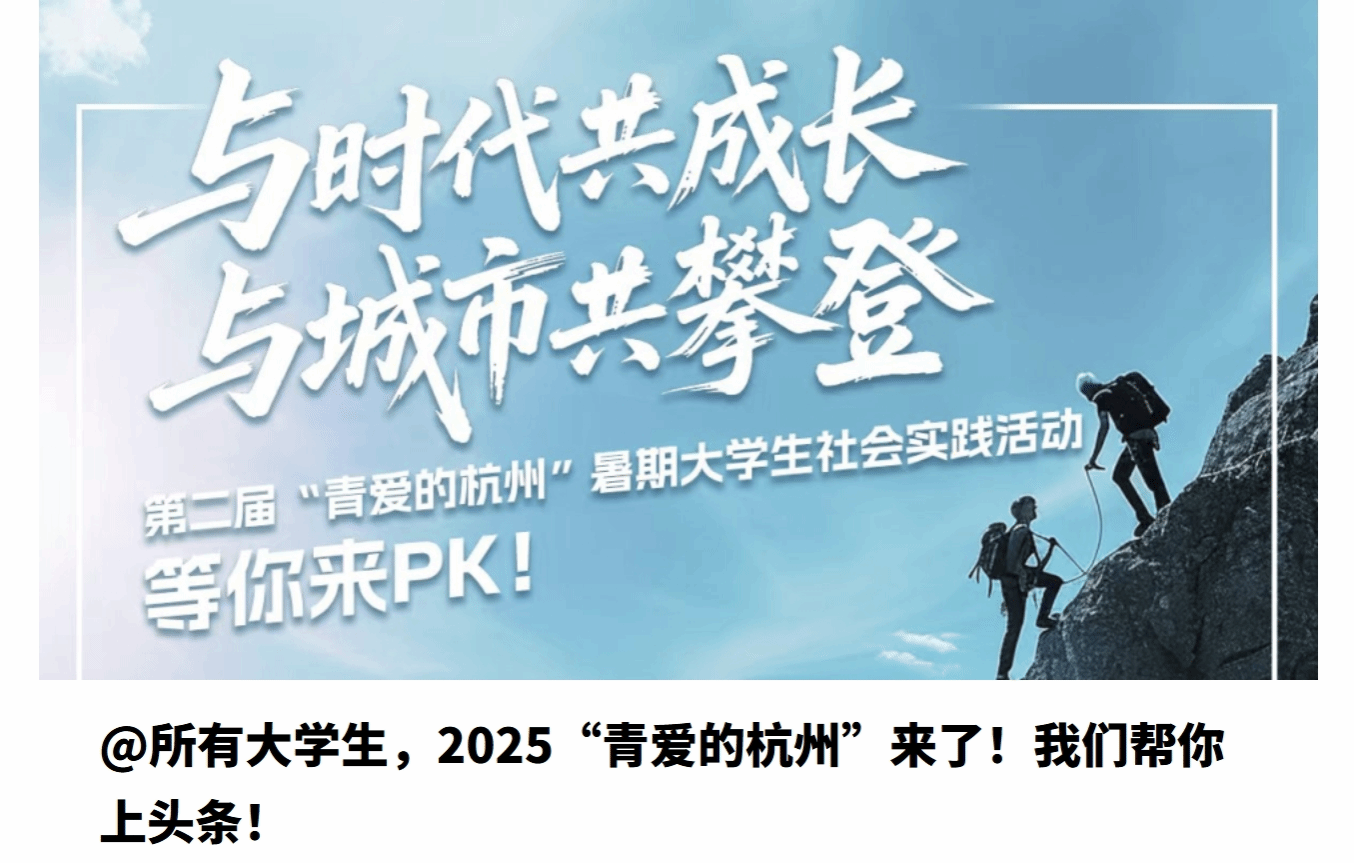 由杭州市委宣传部(市文明办)、杭州市教育局、共青团杭州市委指导,杭州日报主办的第二届“青爱的杭州”暑期大学生社会实践活动(擂台赛)将于2025年6月中下旬正式启动,持续至8月31日。具体主题内容及参赛指南见附录1。