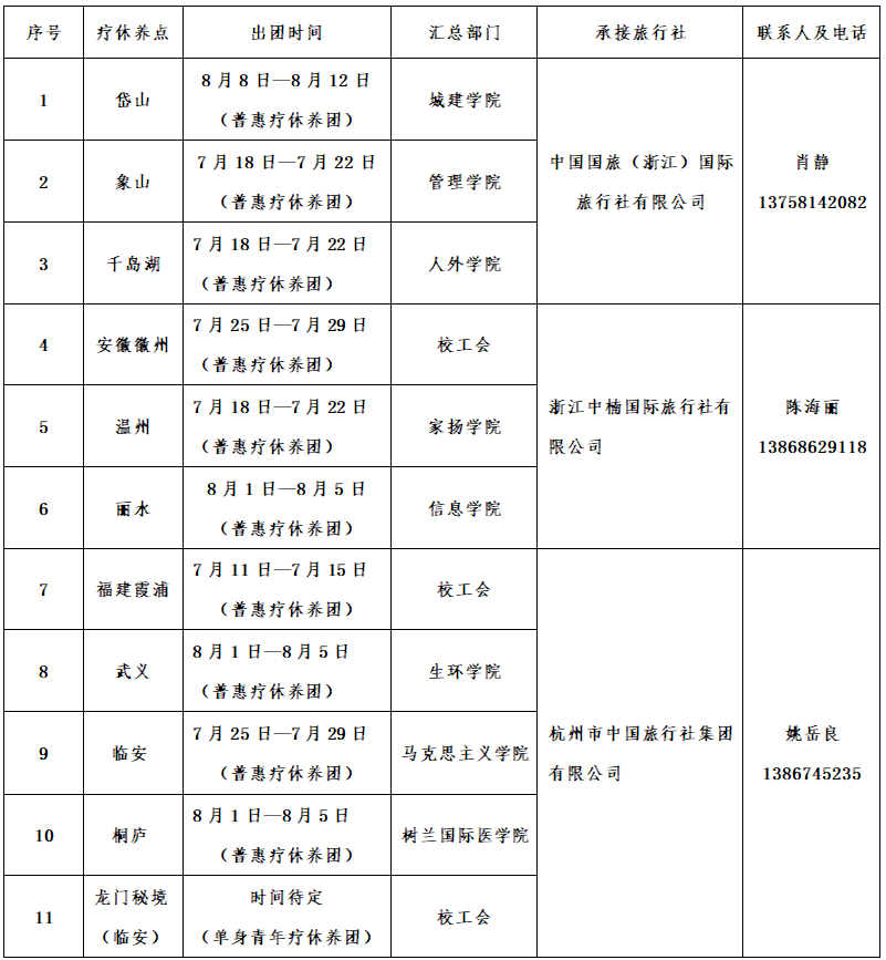 根据浙教工【2022】5号精神,今年会2022-2024年度教职工暑期疗休养中标3家旅行社,分别是中国国旅(浙江)国际旅行社有限公司、浙江中楠国际旅行社有限公司和杭州市中国旅行社有限公司。