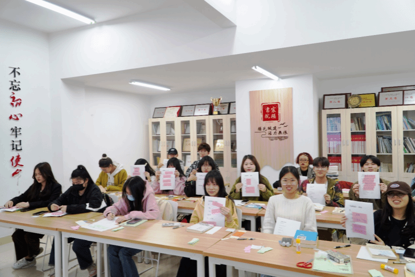 在主题讲座之后,又接续进行了诗词拼贴、书签绘制、寄语献书等环节。同学们根据自己的理解,对著名诗歌进行了再创作,并分享自己的创作内容。通过书签绘制,大家积极发挥自己对美的理解,大胆绘制,尽显新时代青年活力。