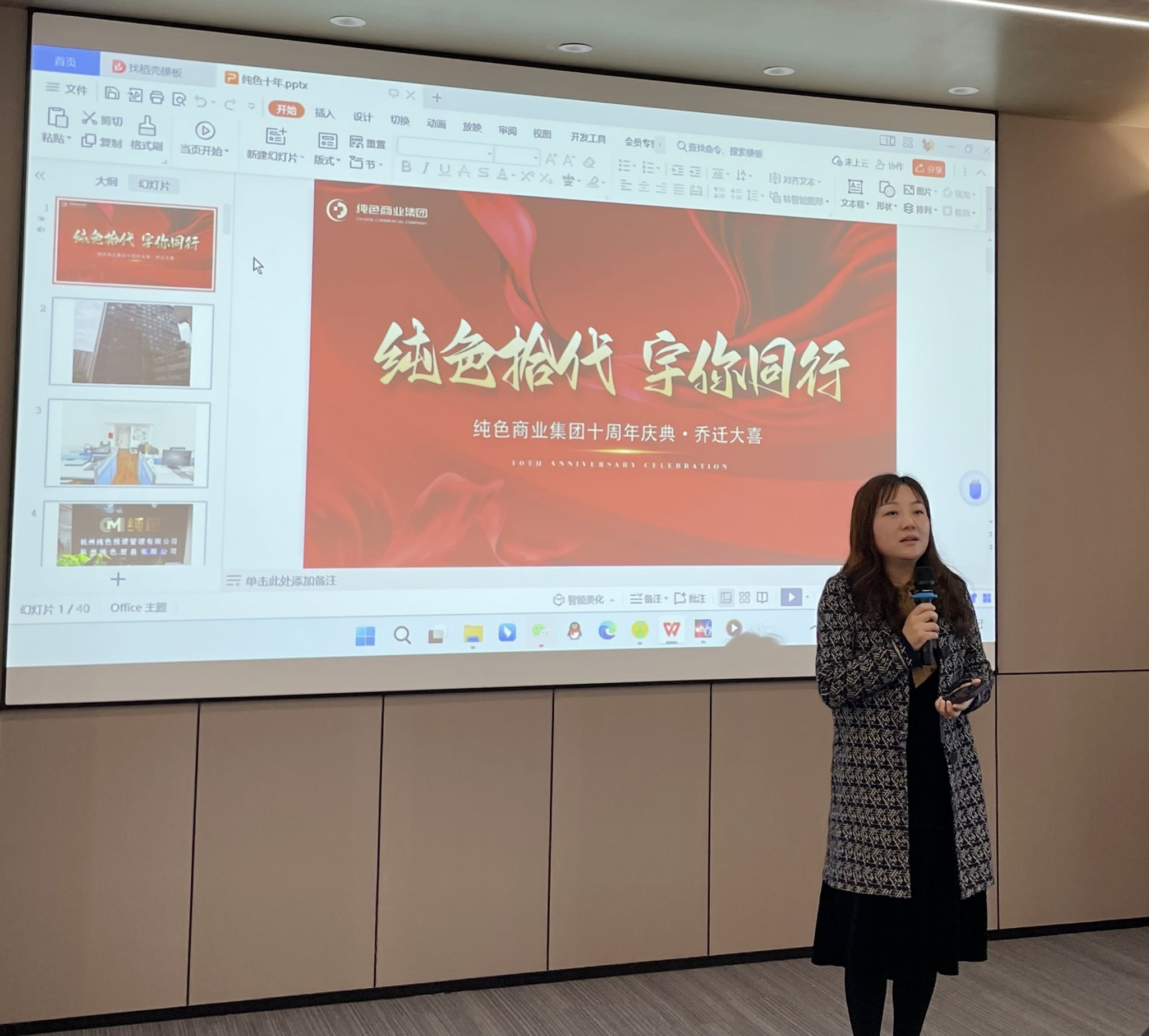 任丹宇、沈旭炯夫妇对母校师生的到访表示热烈的欢迎和衷心的感谢。集团总经办负责人梅波校友带领大家参观了位于杭州滨江“智慧之门”的集团新办公场地,并详细介绍了集团创办的历程、取得的成果以及发展规划和商业布局。经过十年的努力和拼搏,纯色集团已经成长为国内行业优秀企业,产品涉及金融、科技、汽车、供应链、餐饮、健康等多个领域,赢得了众多客户的信赖和支持。