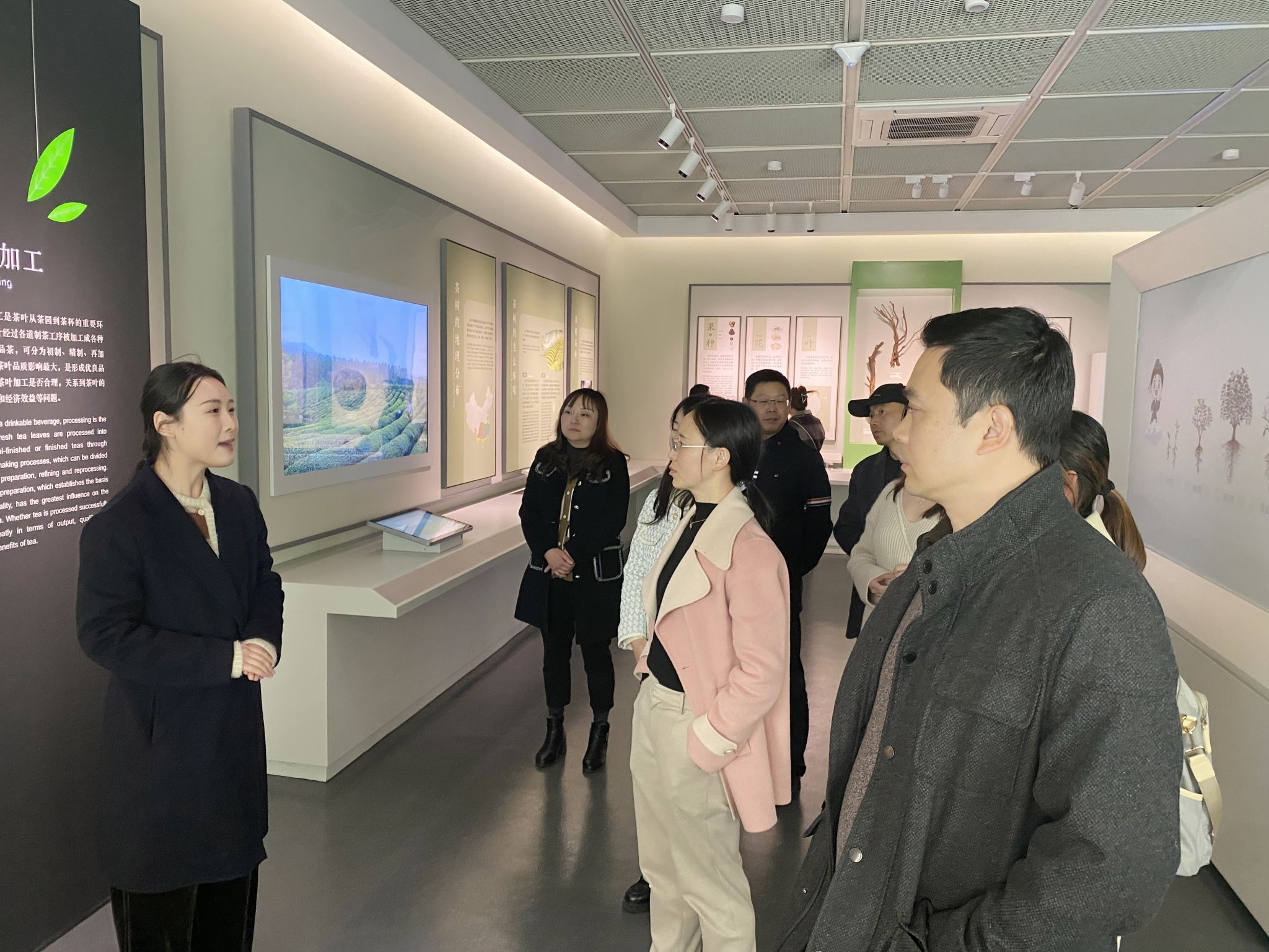 老师们沿着茶间小径漫步至位于龙井路88号的中国茶叶博物馆双峰馆区。馆长包静校友热情接待了双创学院一行。在馆员汪佳璐校友的陪同带领和专业解说下,大家参观了馆内展品,了解制茶杀青、揉捻、干燥等工序,感受承载了千年历史和民族记忆的传统老手艺;认识茶的种类,并近距离体验不同类型的茶香,在醇厚的茶香中,感受传统茶文化的魅力;知悉茶从药用到饮用的历史演变,走进宋代点茶工艺,深入了解我国茶文化历史的源远流长。