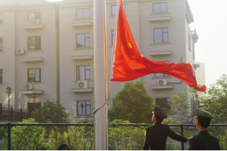 “我是中国人,我是祖国忠诚的儿女!我将继承先烈光荣传统,在攀登知识高峰中追求卓越,在肩负时代重任时行胜于言,在真刀真枪的实干中成就一番事业,在青春赛道上奋力奔跑,争取跑出当代青年的最好成绩,以青春之名,书写清澈挚爱,以心中红星,献礼盛世中华!”随着升旗仪式的结束,现场师生在国旗下许下青春的承诺和誓言。