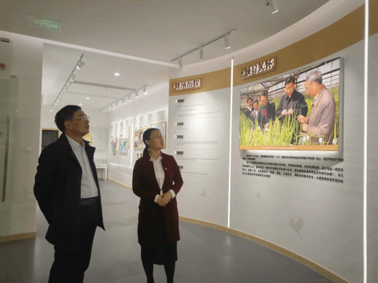 讲座前,周光迅教授在中国水稻研究所科研管理与国际合作处副处长申红芳的陪同下参观了建设成就展厅,了解了水稻所的发展历程、建所成就及党建成果。