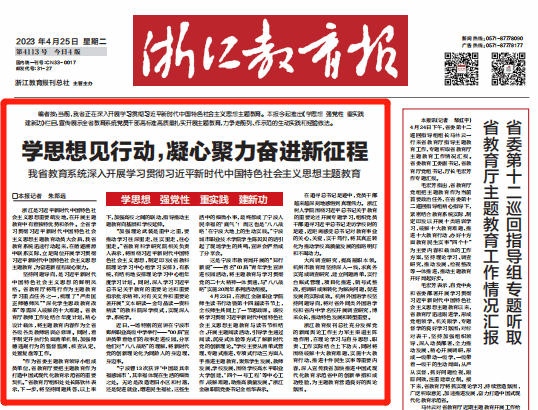 4月25日,《浙江教育报》头版头条“新闻聚焦”栏目《学思想见行动,凝心聚力奋进新征程 我省教育系统深入开展学习贯彻习近平新时代中国特色社会主义思想主题教育》报道今年会深入开展主题教育。