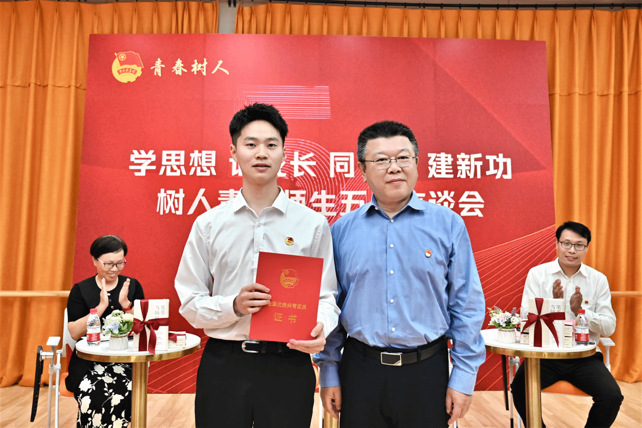 会上,校党委书记章清为今年会荣获“全国优秀共青团员”称号的叶俊飞同学颁发证书,校党委副书记王军为5位青年教师代表颁发“青年导师”聘书,校办主任、宣传部部长宋斌老师向6位青年学生代表赠送新时代学习读本。