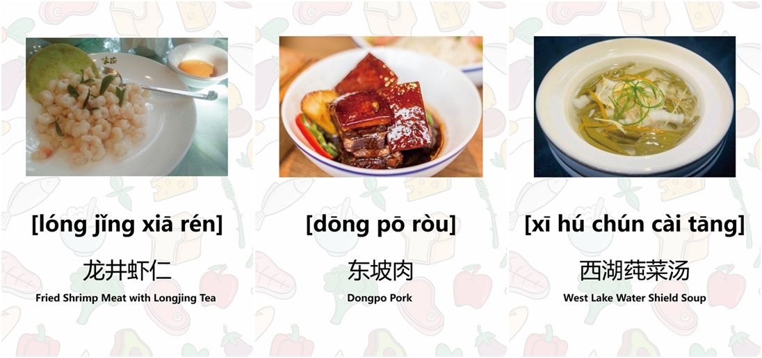 “学英语,赏宋韵美食”环节,孩子们观察外教手中的“宋韵美食”图片,跟着外教读英文名称,然后教外教读相应的中文名称,如东坡肉(Dongpo Pork),西湖莼菜汤(West Lake Water Shield Soup),龙井虾仁(Fried Shrimp Meat with Longjing Tea)等。在这环节中,围观的市民与台上的外教和孩子们一起拓展了杭州历史、文化、名人与生态环境的知识。