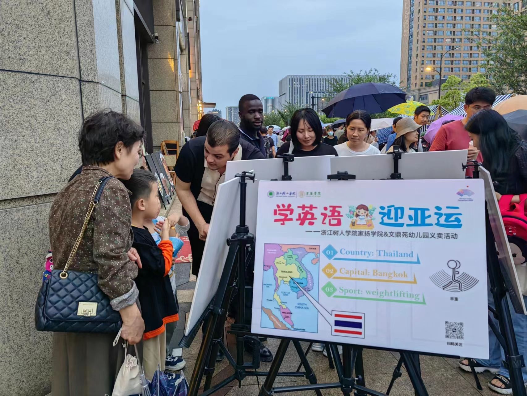 在“学英语,赏魅力亚洲”活动中,根据幼儿园小朋友的认知特点,大家设计了三个互动环节:看一看,观察亚运会参赛国家的地图和国旗以及参赛项目的图像标识;读一读,跟着外教读相关的国家、首都与参赛项目的英文名称;动一动,让孩子手脑协作,模仿亚运会赛事项目。孩子在爸爸妈妈的陪伴下,与外教进行积极互动,吸引了不少路人驻足围观,在加深孩子们对亚运会的理解的同时,也让杭州市民对亚运会和亚洲魅力有了更深刻的体验和认识。