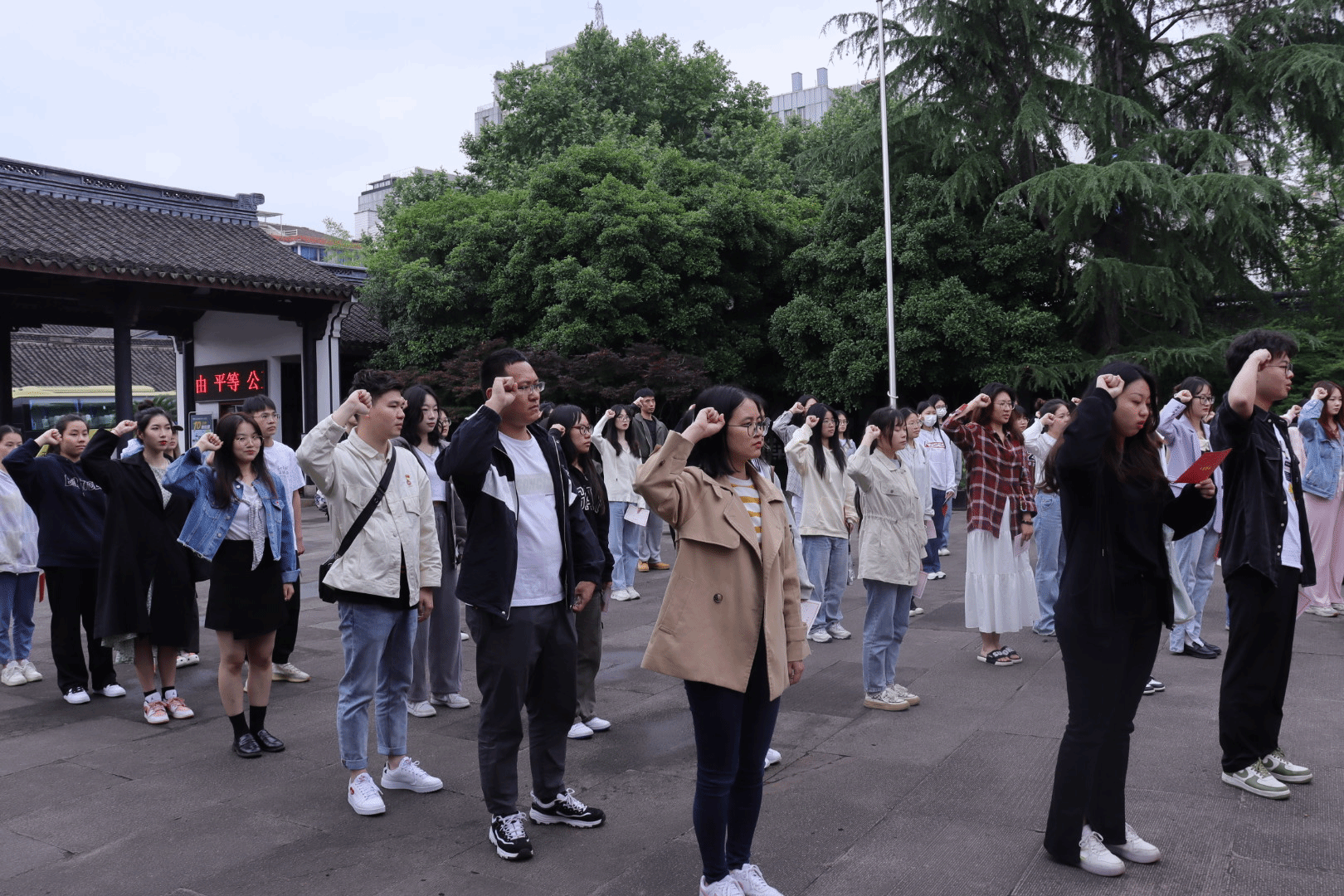 离开纪念馆,来到中心广场,所有学生党员面向党旗,重温入党誓词,在庄严的宣誓声中,党员同志们回顾入党初心,感悟作为一名共产党人的使命和担当。