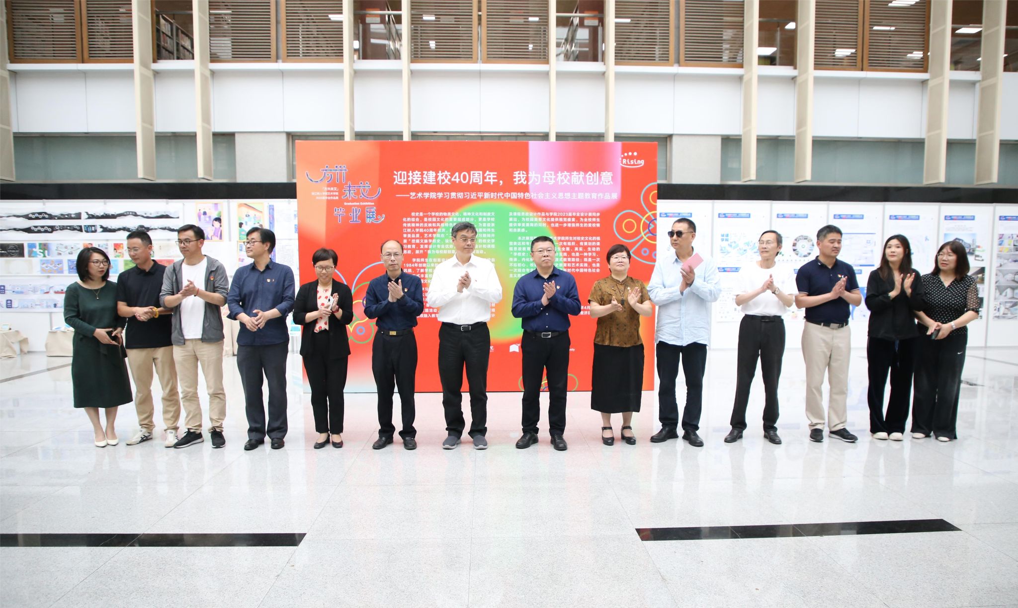 首先,艺术学院院长赵燕致欢迎词:艺术学院结合专业为校园文化建设增添艺术氛围,提升校园审美品质的专业展览,也是艺术学院分党委结合专业“挖掘文脉学校史,设计创意温初心”的校史学习教育活动。这次展览有3个系科17位教师结合课程思政融入毕业设计和课程教学,105位同学的58组设计作品与学院2023届毕业设计展同步展出,既是学院教育教学和立德树人的一种专业结合方式,也是学生向学校、社会递交的一份艺术设计教育答卷,更是为校园美育文化提供视觉盛宴。