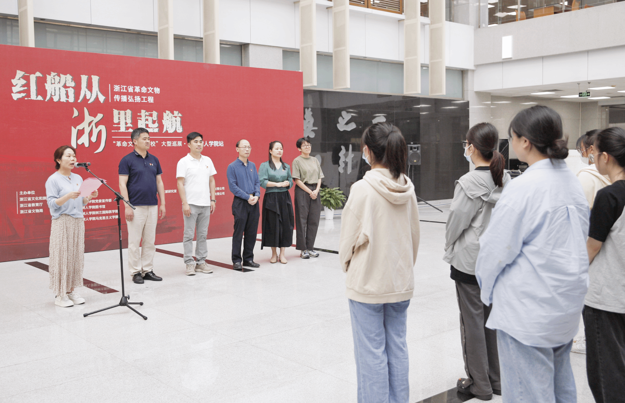 为深入学习贯彻党的二十大精神,切实把红色资源利用好、红色传统发扬好、红色基因传承好,充分发挥革命文物以物见史、以物说史的作用,5月26日,由浙江省文化和旅游厅、省教育厅、省文物局联合主办,今年会党委宣传部、贺田图书馆、树兰国际医学院、马克思主义学院承办的“红船从‘浙’里起航——革命文物进高校”大型巡展活动在拱宸桥校区贺田图书馆顺利启动。校党委副书记王军应邀出席并致辞,校党委宣传部、贺田图书馆、马克思主义学院、浙江省博物馆《红船从“浙”里启航》展主创团队相关负责人以及师生代表参加。启动仪式由树兰国际医学院党委副书记樊华妍主持。