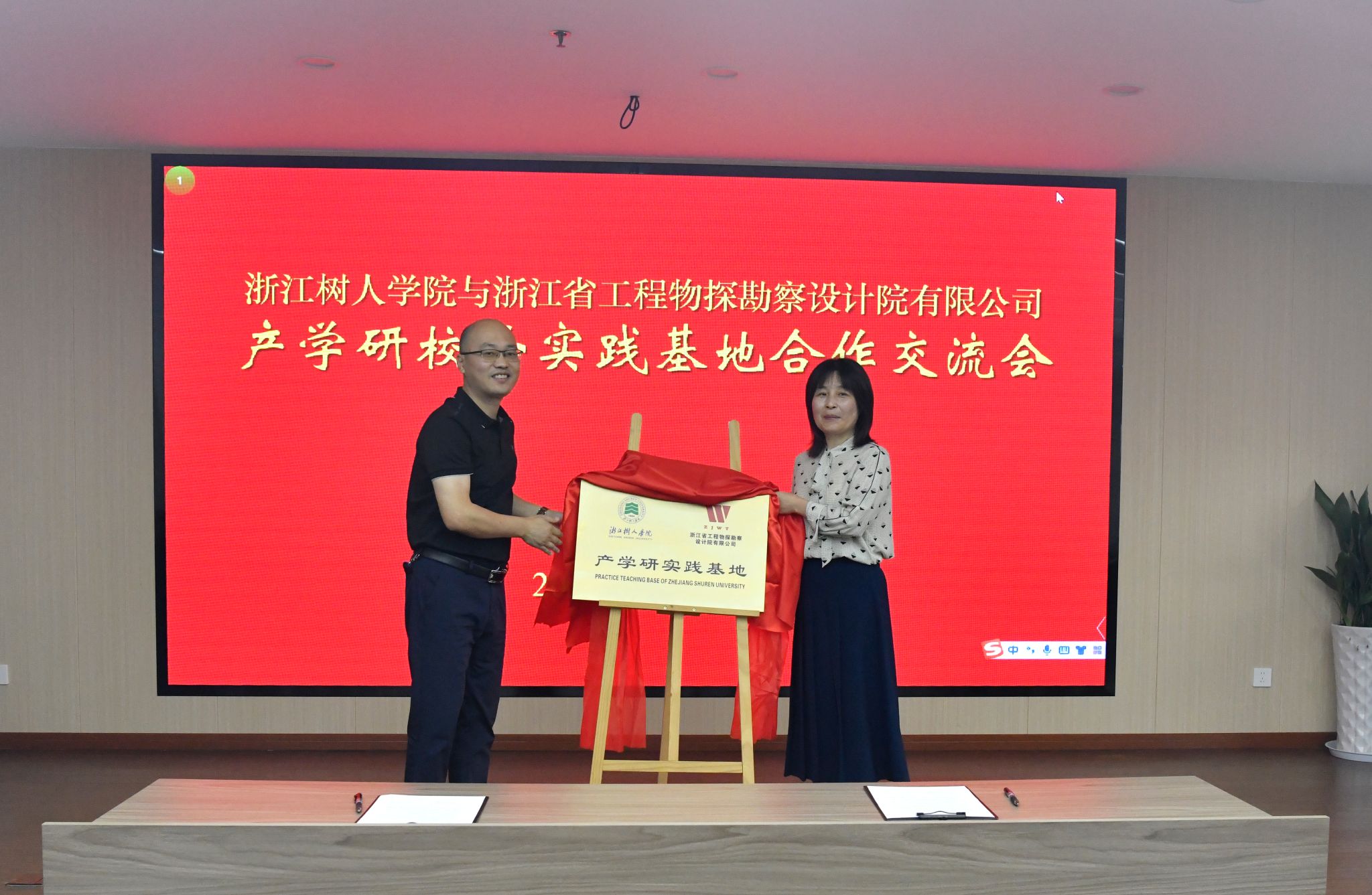 林海与金小群代表校企双方签订了校企合作协议,并为“产学研实践基地”揭牌。