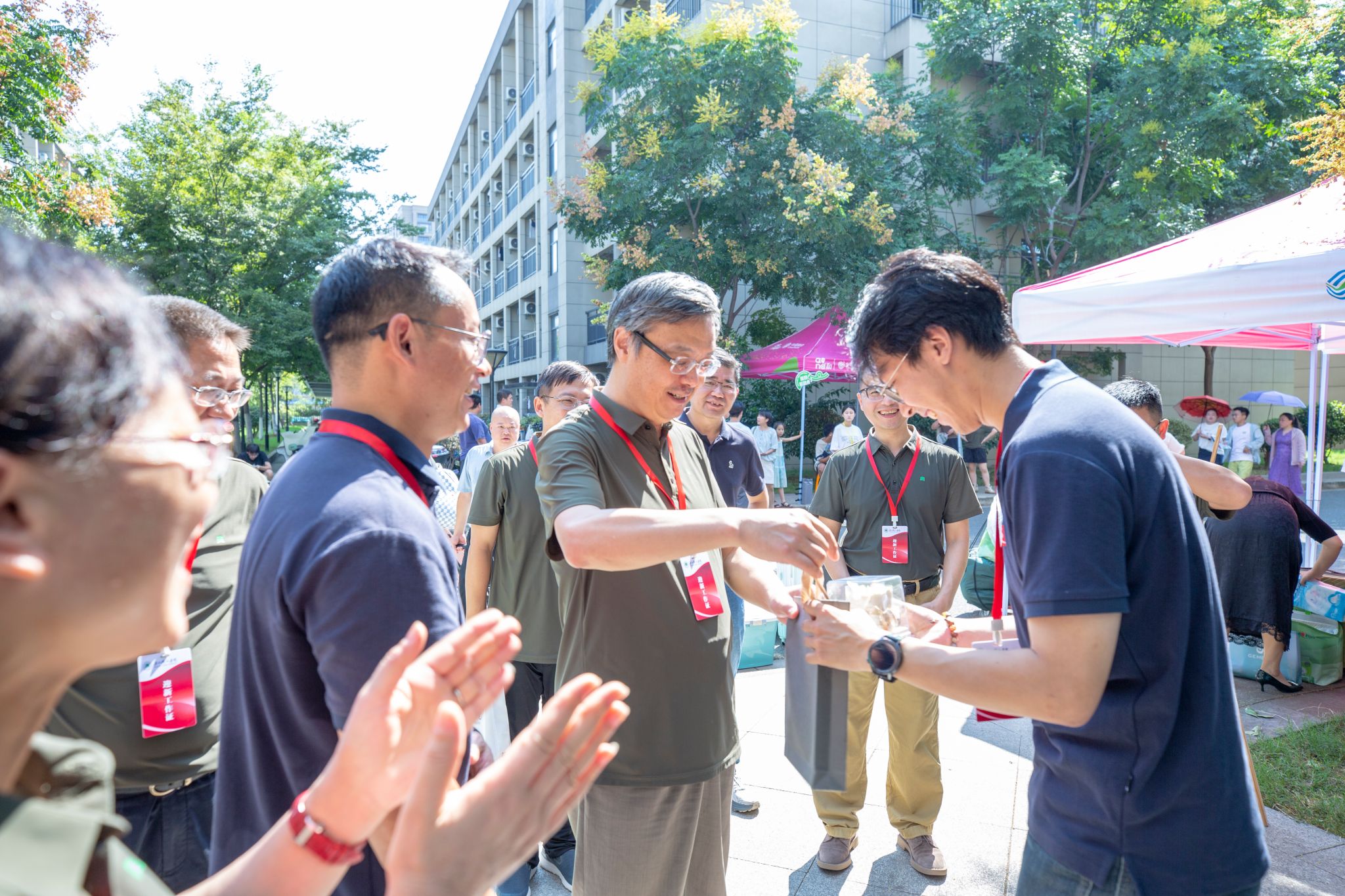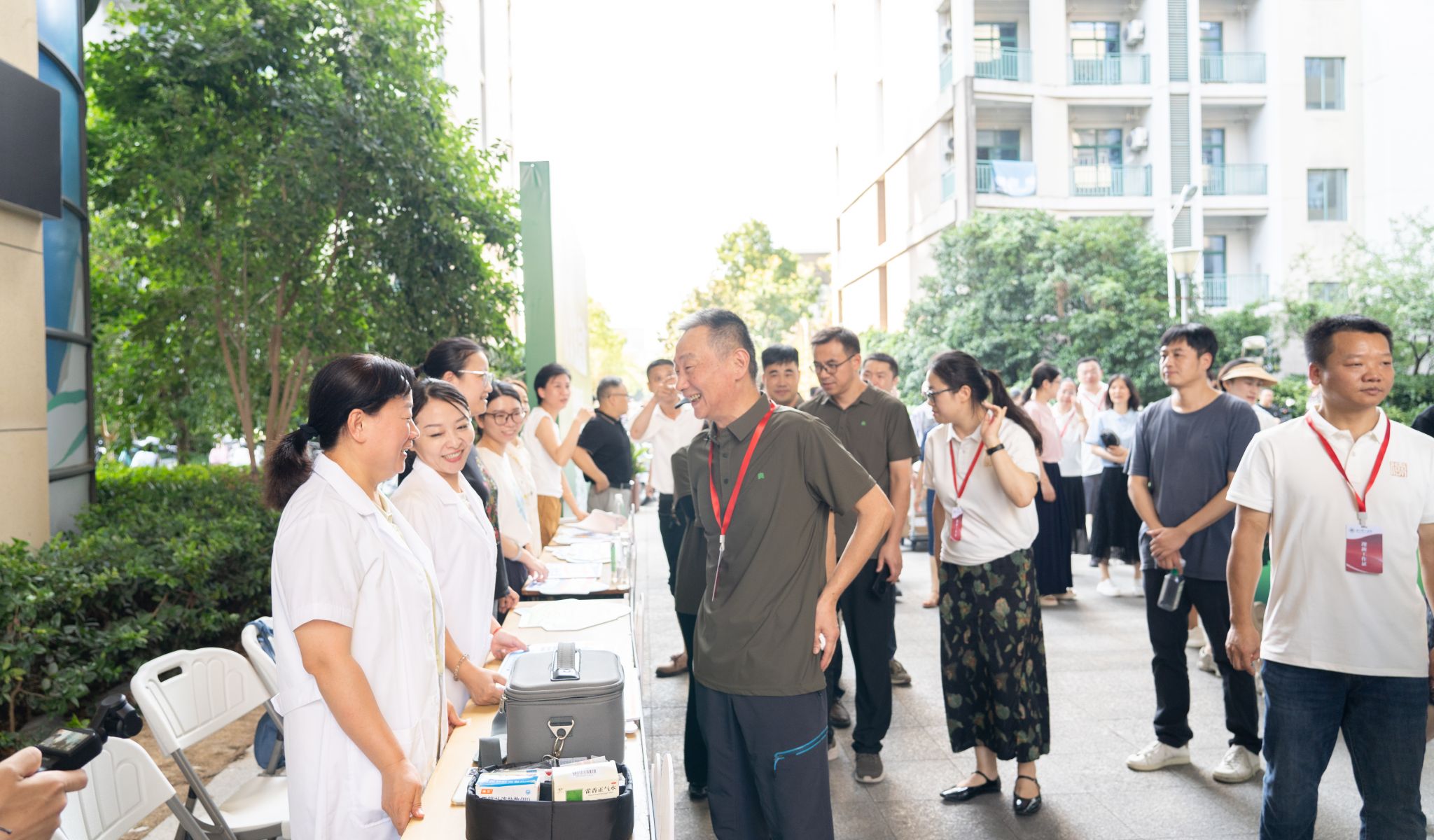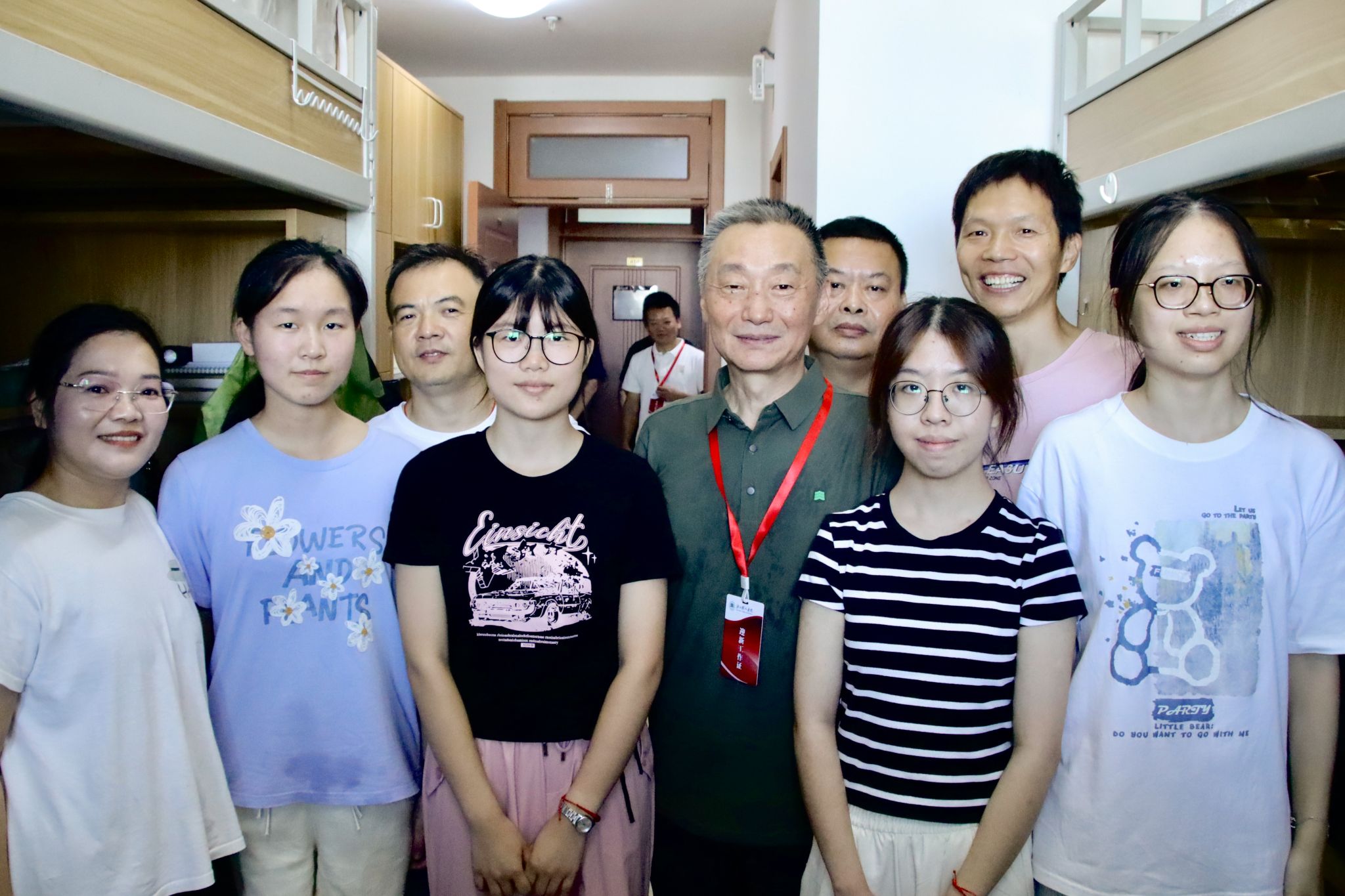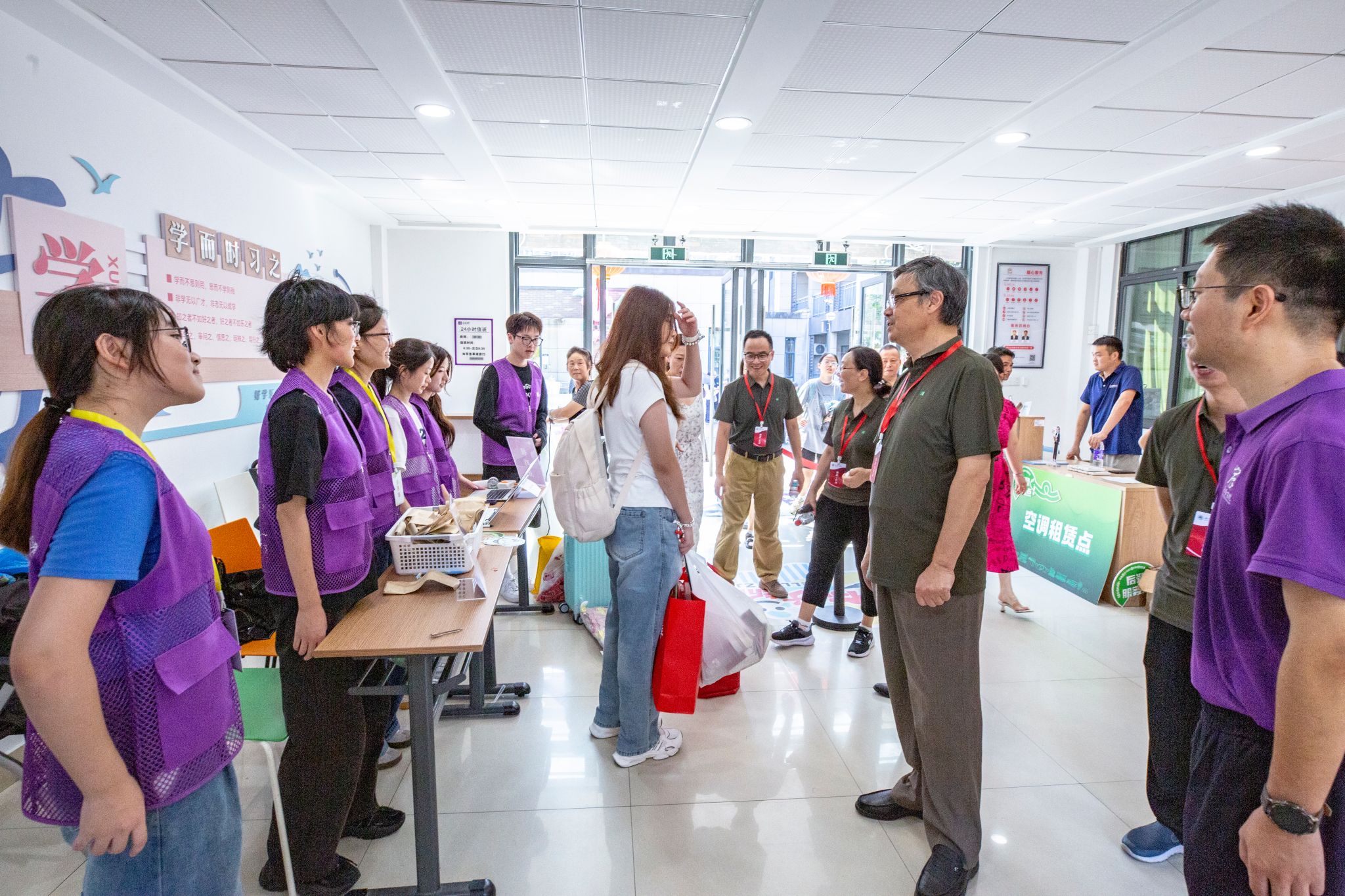 在迎新点、学生寝室,学校领导一行看望前来报到的新生,与新生进行热情地交流,询问其生源地、专业选择及未来规划,几句亲切的家常、一声声真挚的叮嘱,消融了新生们的拘谨。学校领导们向同学分享着大学生活经验,耐心解答疑问,鼓励大家尽快适应大学生活,逐渐融入树人大家庭,眼中饱含对新一代树人学子的殷切期望,并与他们合影留念。与此同时,对于忙碌的工作人员和“红马甲”志愿者们,学校领导们的一句“辛苦了!”、一份肯定的赞许,成了他们最好的“能量补给”。