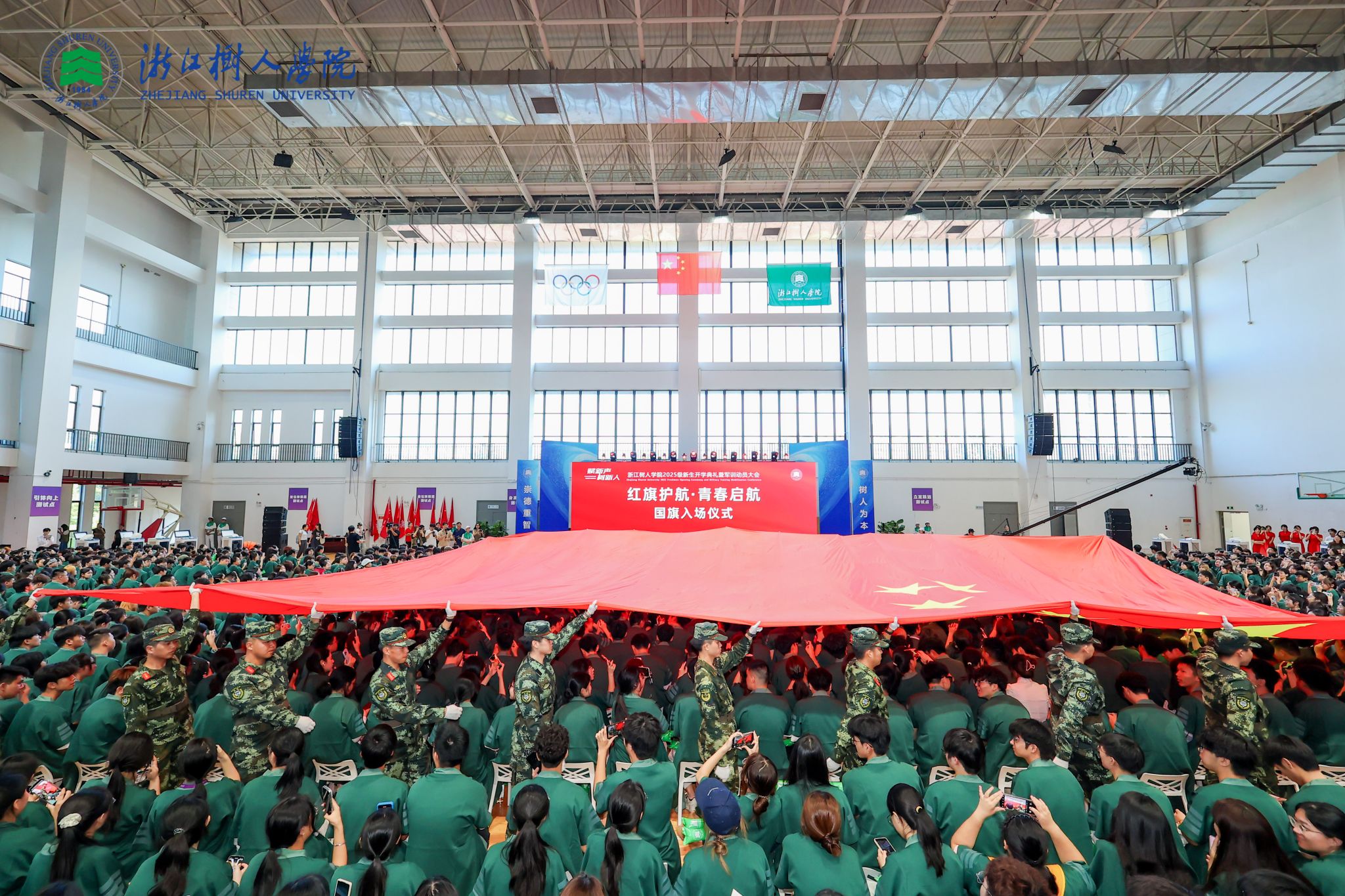 典礼在庄严的国旗入场仪式中拉开帷幕。军训教官迈着铿锵步伐,护送巨幅国旗庄严入场。国旗从头顶缓缓经过,象征着时代的接力棒传递到新一代青年手中。随后,校旗、院旗、领导与嘉宾依次入场,为仪式增添了期许与嘱托。