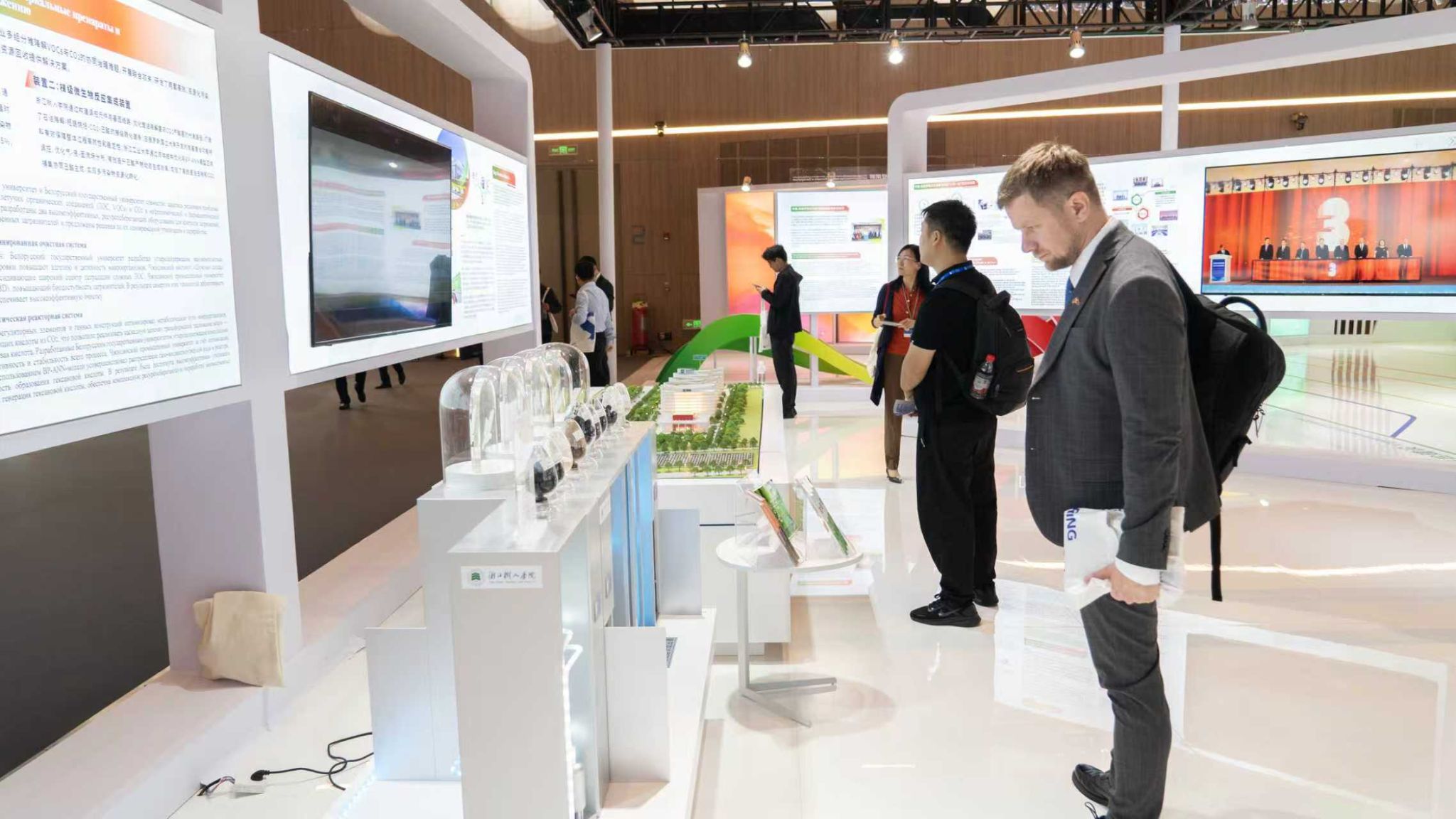 展览现场,“生物质填料、功能菌剂及资源化集成装置”作为实物成果,经科技部遴选,获两国副总理及科技主管部门领导巡展。该技术聚焦石化行业含油废水与CO₂排放问题,联合白方研发竹炭基吸附材料、功能菌剂及梯级微生物反应装置,将含油废水与CO₂转化为高附加值有机酸,实现“污染削减、碳固定、资源再生”三重效益。