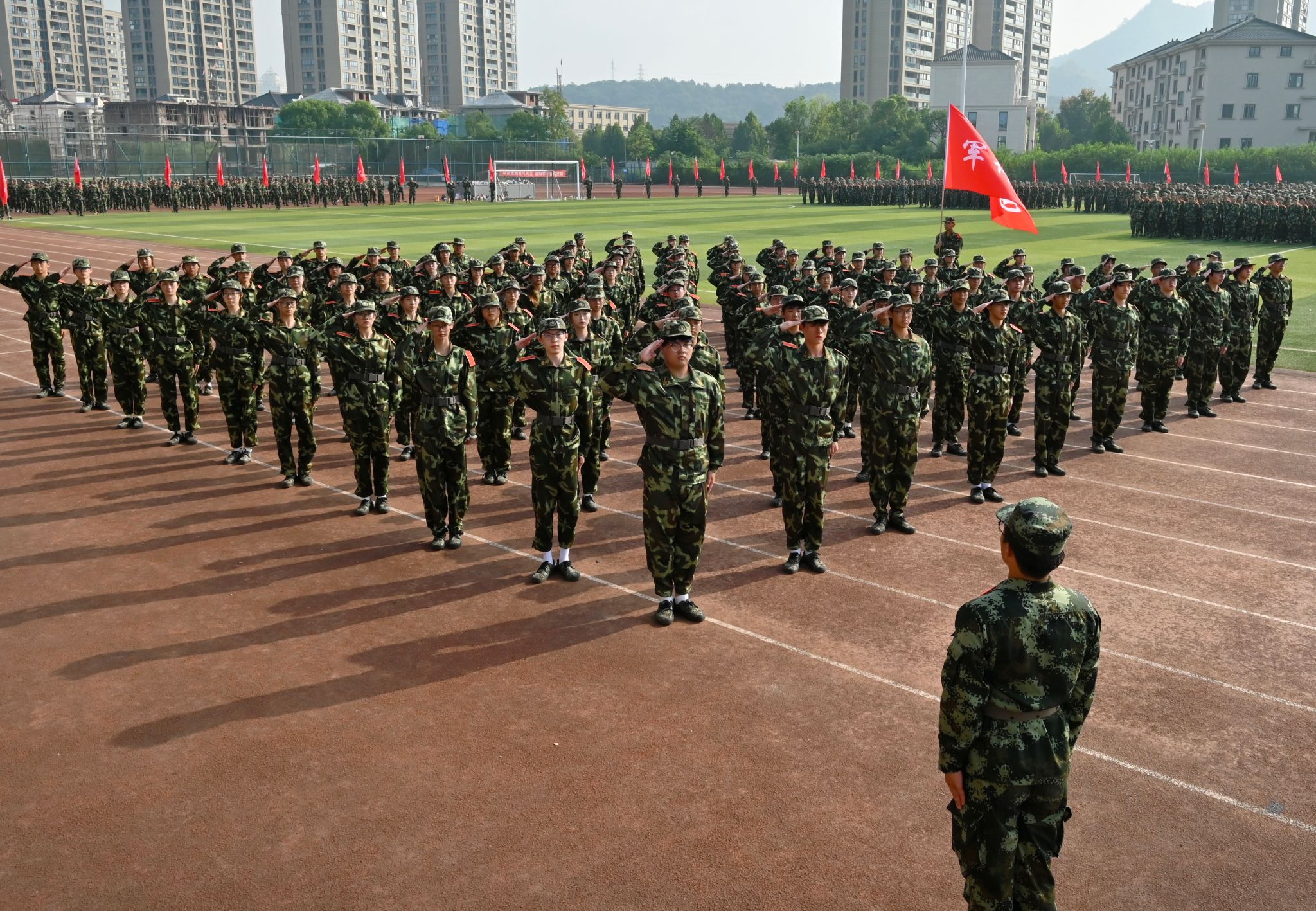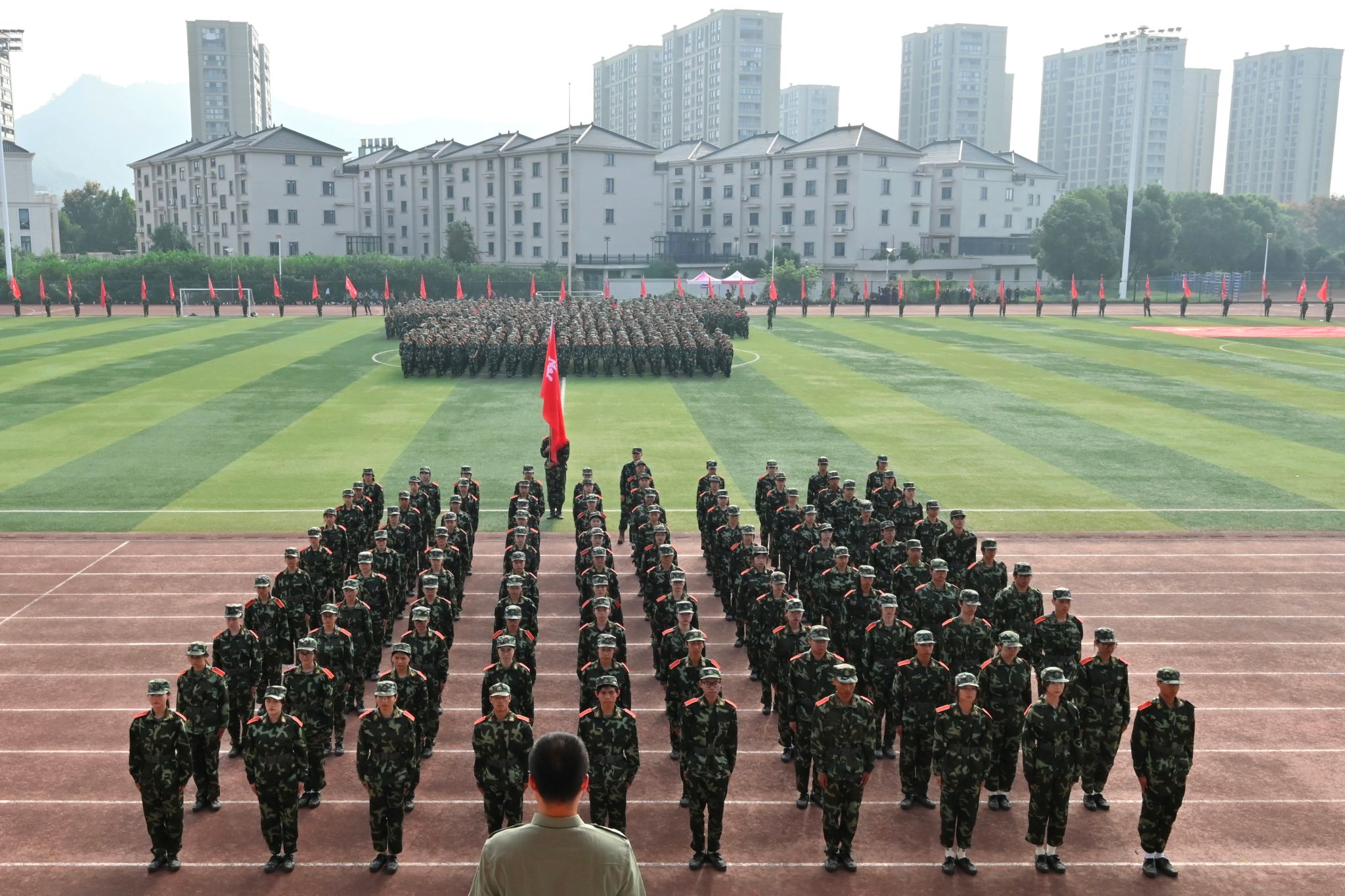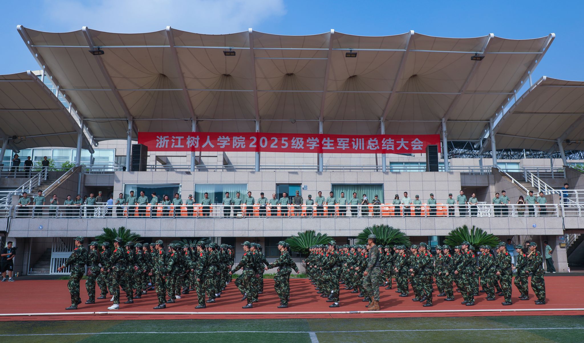 军训团政委王军、军训团团长冯淑娟分别在两校区作军训总结讲话。他们对通过艰苦训练,以顽强的意志和出色的表现圆满完成军训任务的全体参训同学表示问候,向承担本次军训工作的树人先锋营的同学们表示感谢,向受到表彰的团队和个人表示祝贺,向各方保障力量致以敬意。今年是纪念中国人民抗日战争暨世界反法西斯战争胜利80周年,9月3日在天安门广场隆重举行了纪念大会以及阅兵仪式,在这个特殊的时间节点,他们希望同学们传承并弘扬伟大的“抗战精神”,坚定不移践行“树人精神”,将这份爱国情怀和团结奋斗的精神融入新时代青年的成长之中,努力成长为德智体美劳全面发展的社会主义建设者和接班人,为学校推进 “名校民办” 建设、早日实现 “升大正名” 的奋斗目标同心同德、奋勇拼搏。