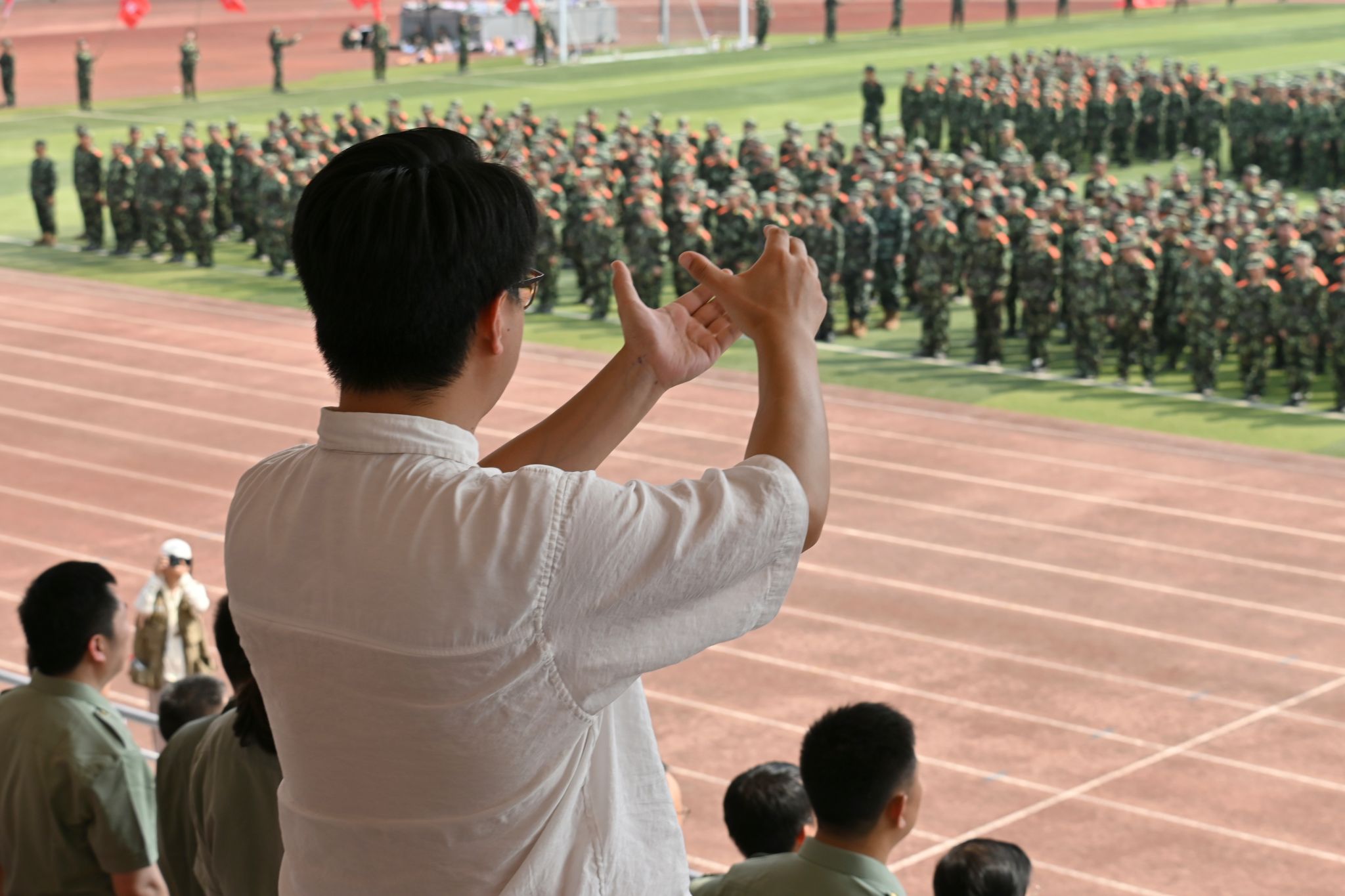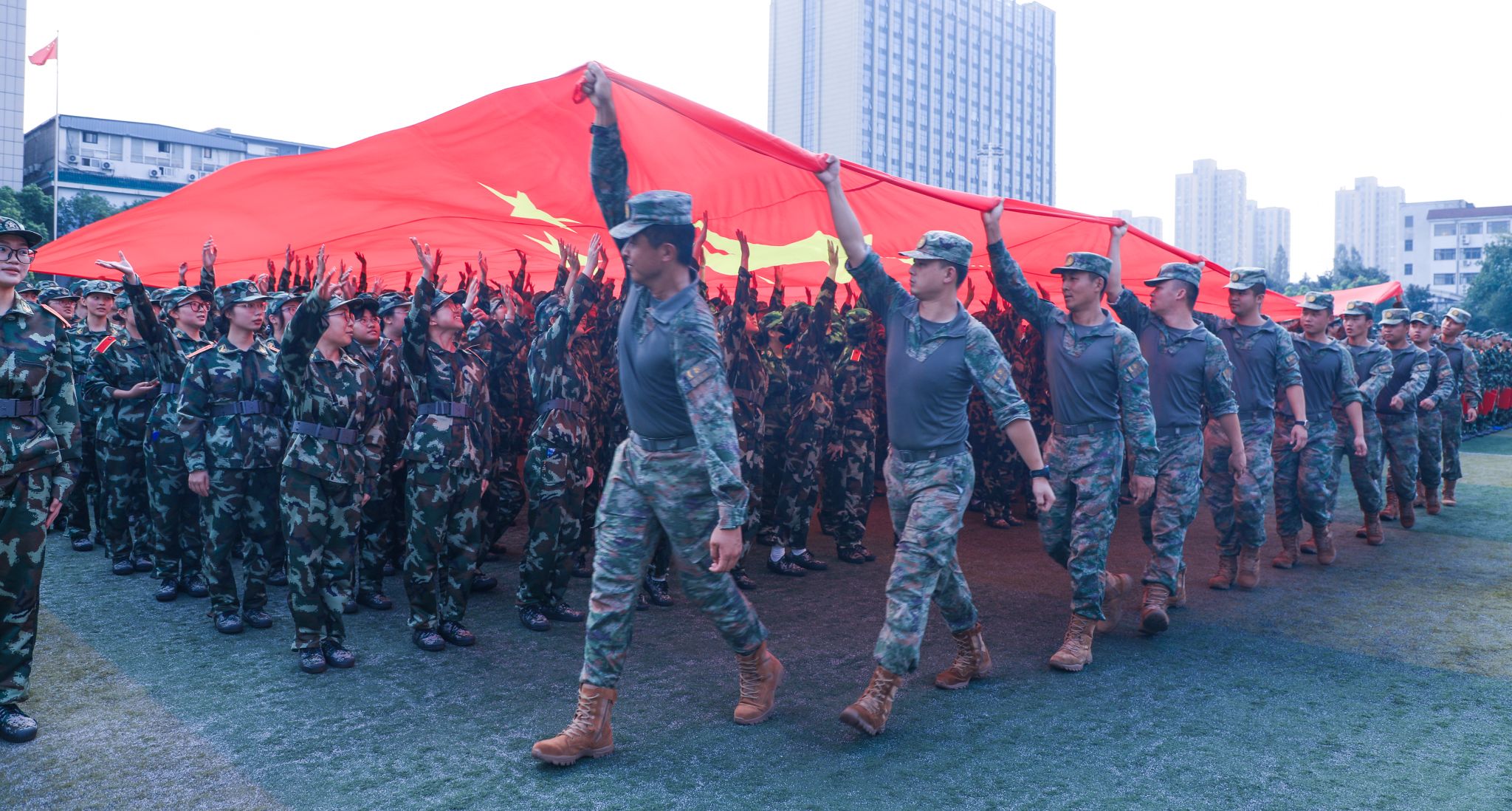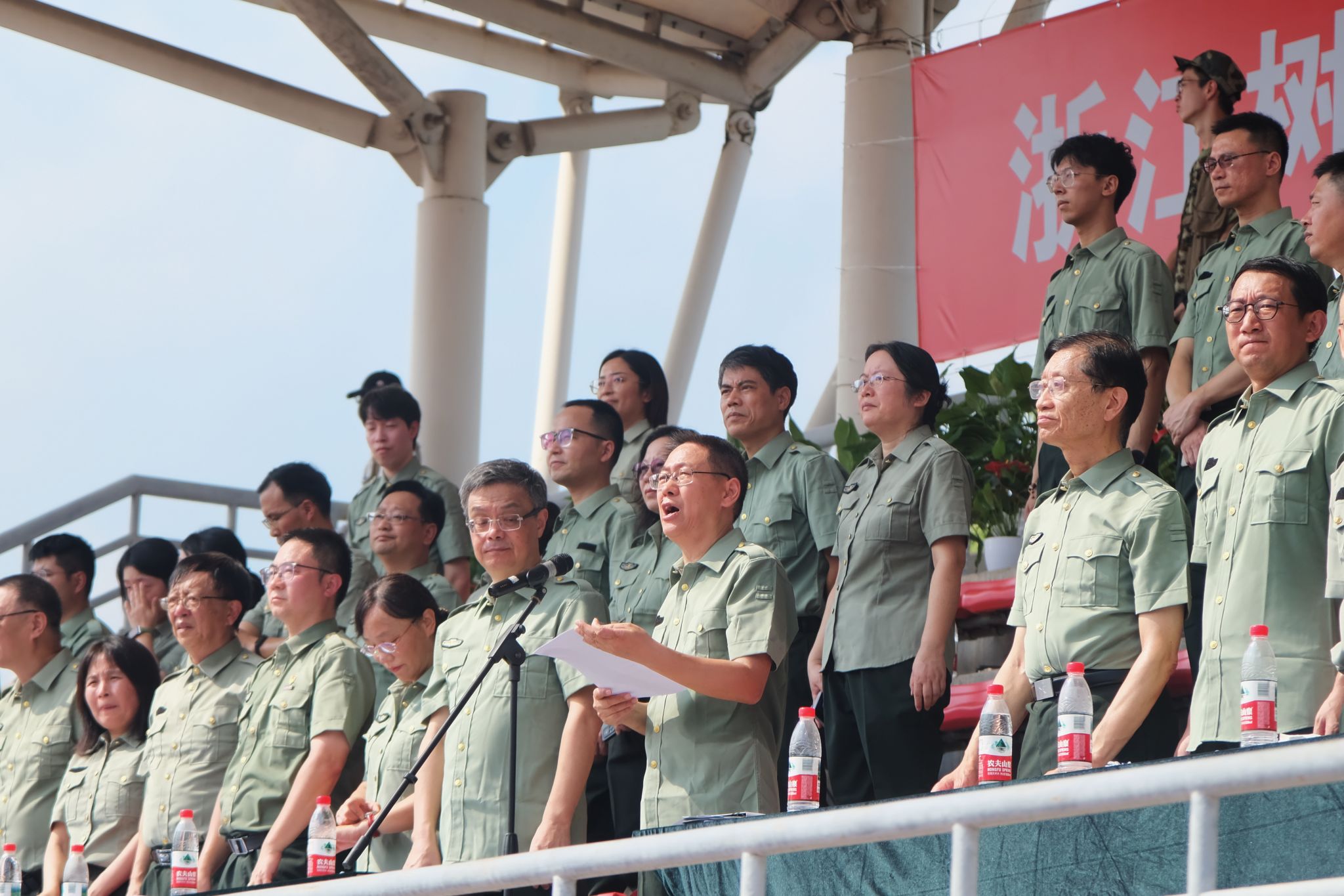 军训团政委王军、军训团团长冯淑娟分别在两校区作军训总结讲话。他们对通过艰苦训练,以顽强的意志和出色的表现圆满完成军训任务的全体参训同学表示问候,向承担本次军训工作的树人先锋营的同学们表示感谢,向受到表彰的团队和个人表示祝贺,向各方保障力量致以敬意。今年是纪念中国人民抗日战争暨世界反法西斯战争胜利80周年,9月3日在天安门广场隆重举行了纪念大会以及阅兵仪式,在这个特殊的时间节点,他们希望同学们传承并弘扬伟大的“抗战精神”,坚定不移践行“树人精神”,将这份爱国情怀和团结奋斗的精神融入新时代青年的成长之中,努力成长为德智体美劳全面发展的社会主义建设者和接班人,为学校推进 “名校民办” 建设、早日实现 “升大正名” 的奋斗目标同心同德、奋勇拼搏。
