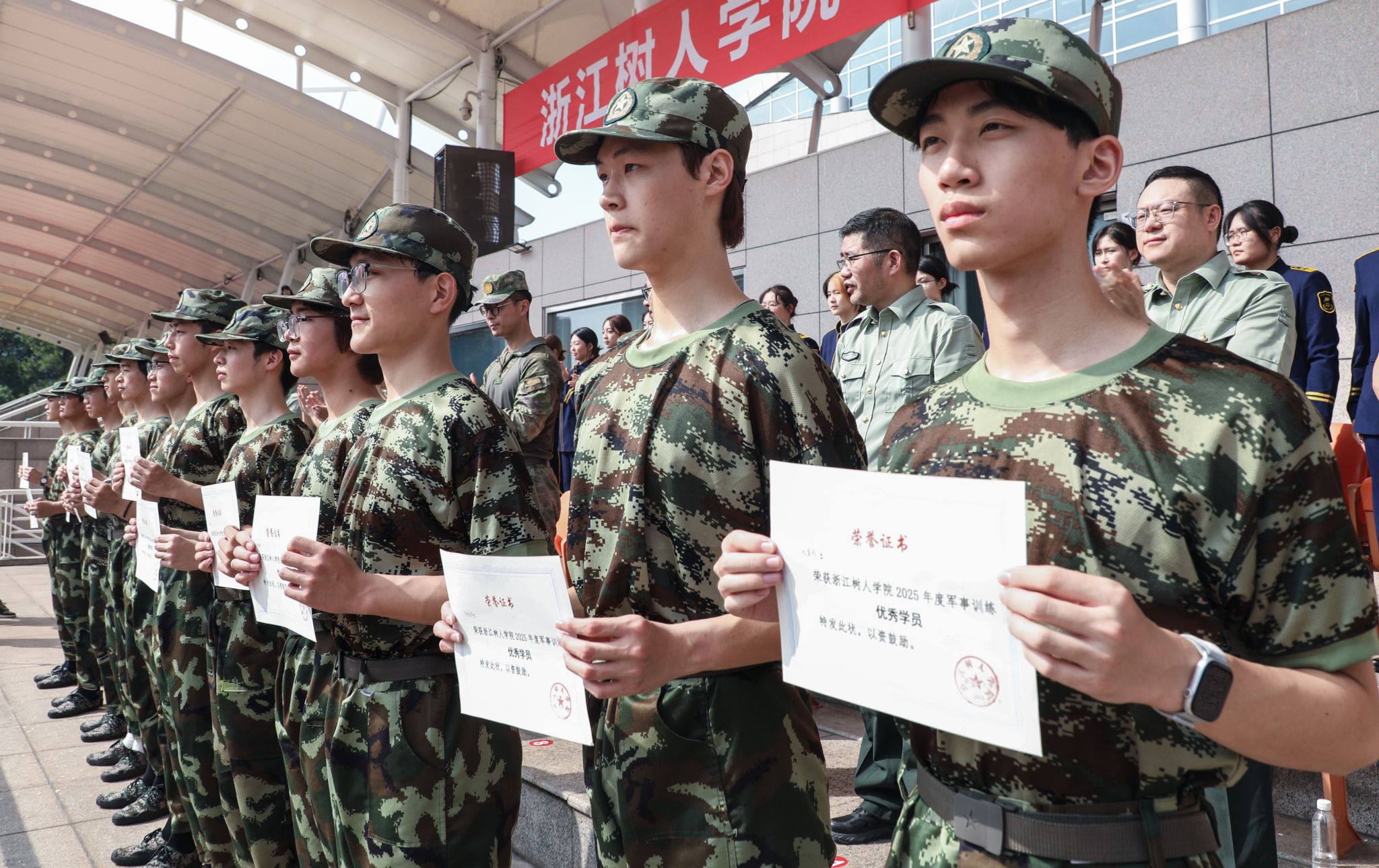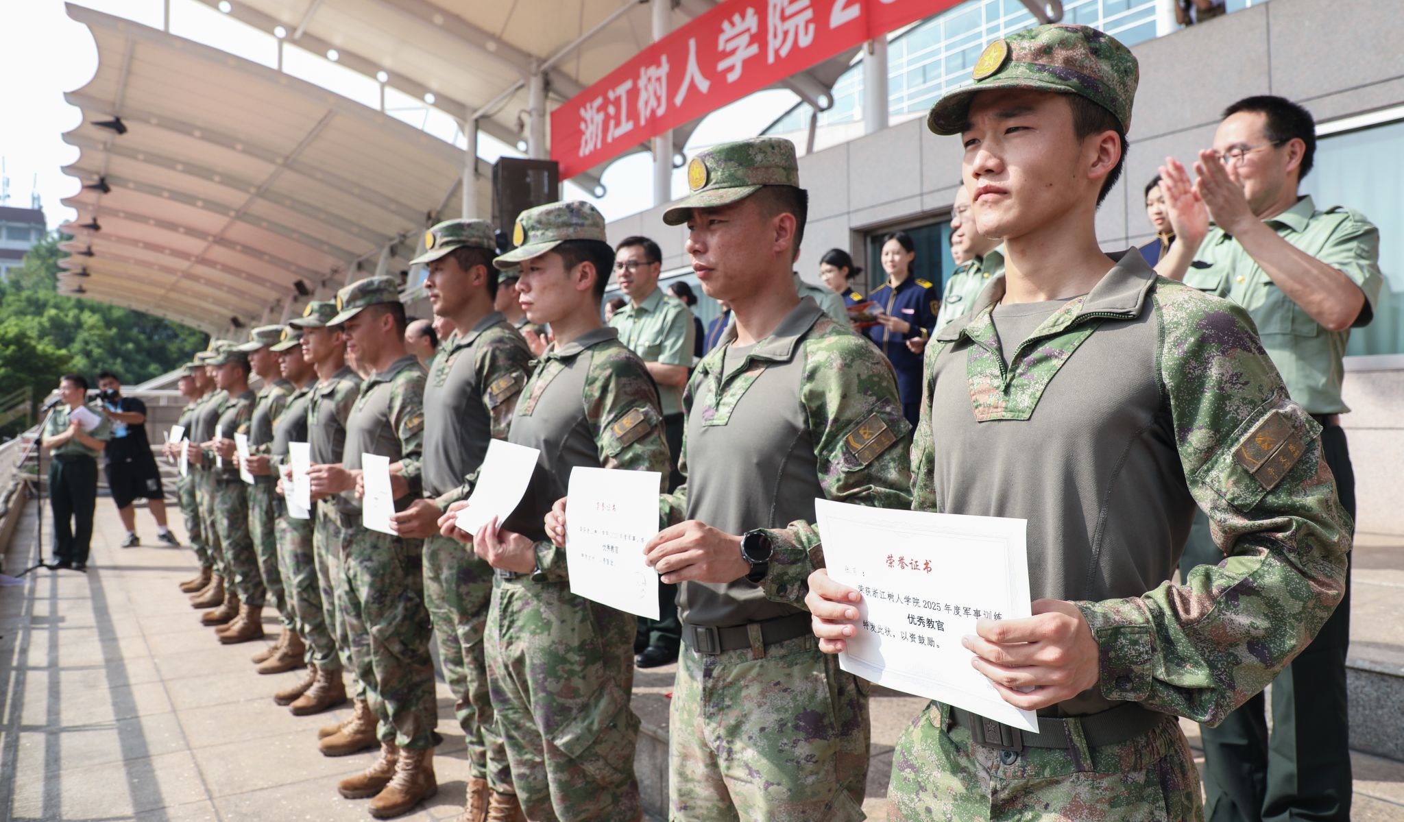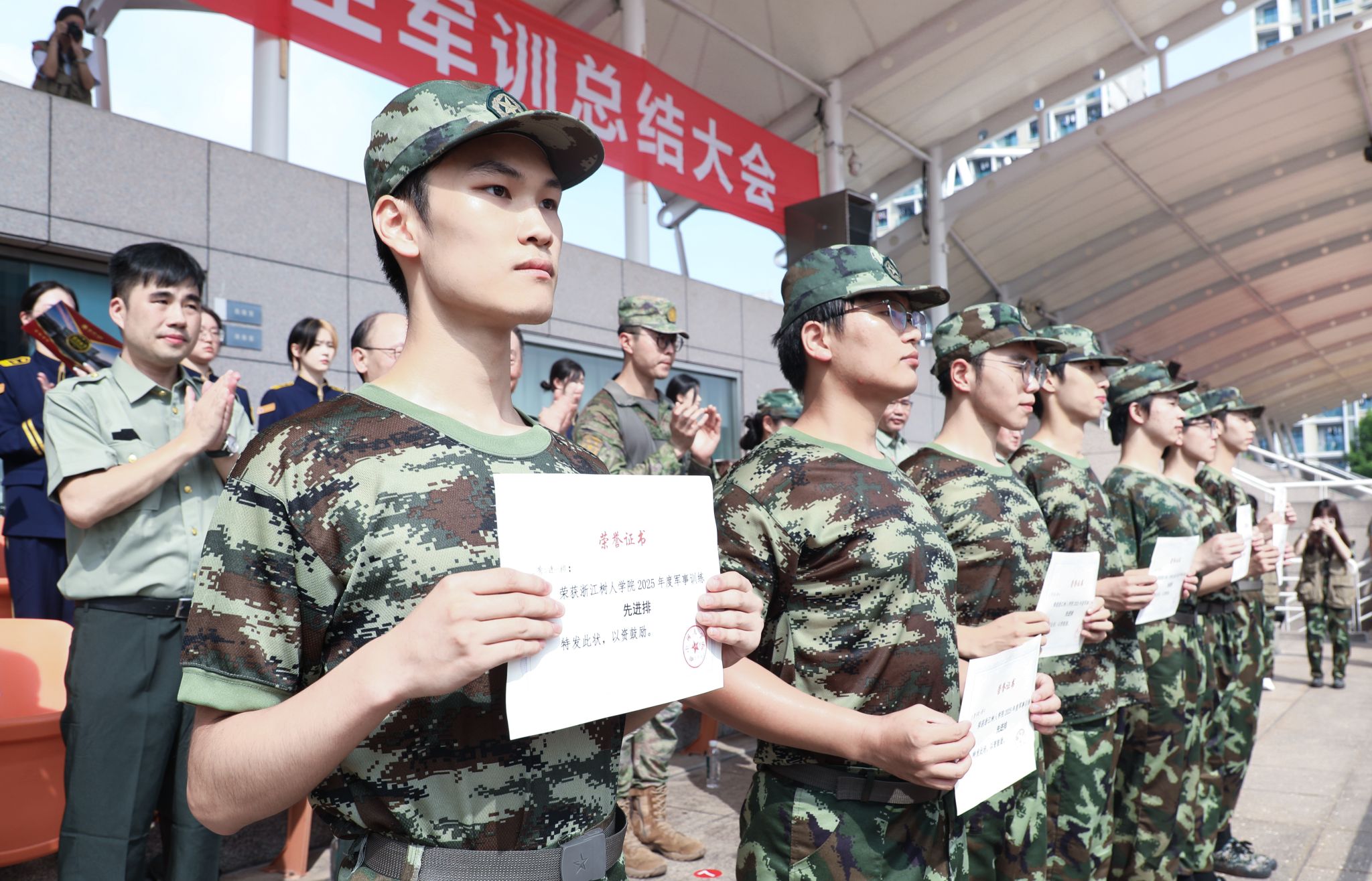 大会表彰环节,陈新民、王方分别宣读军训团表彰文件,对军训期间表现突出的先进集体与个人予以肯定。与会领导为获得 “先进排”“内务卫生优胜寝室”“优胜方阵” 荣誉的集体以及 “优秀教官”“优秀指导员”“优秀学员” 称号的个人依次颁发荣誉证书。