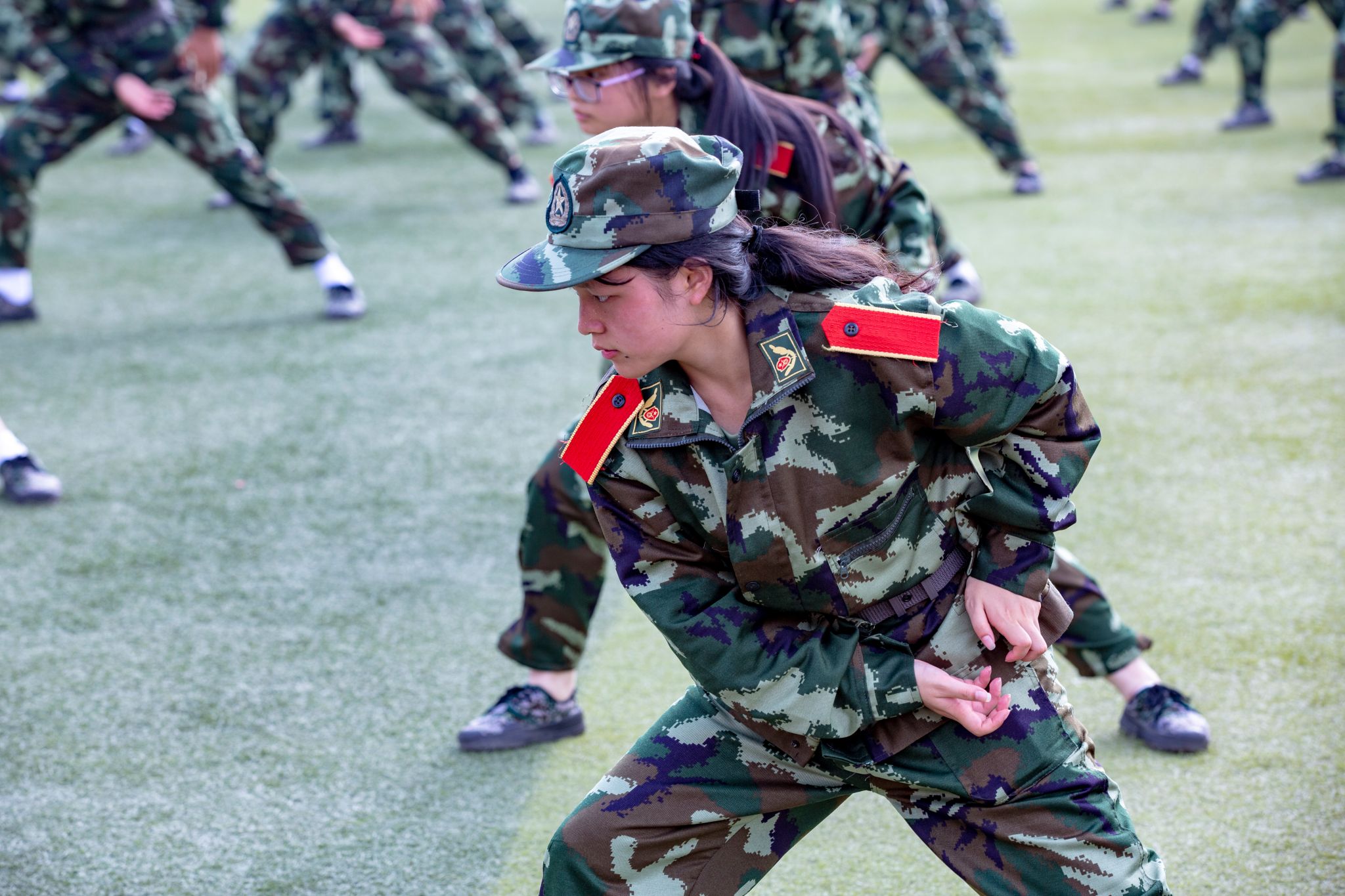 随后,12支书院会操方阵依次迈着铿锵有力的步伐通过主席台,新生们身着统一的迷彩服,摆臂踢腿整齐划一,嘹亮的“青春向党、强国有我”口号响彻校园,将历经14天淬炼后的昂扬风貌、坚定眼神与蓬勃朝气展现得淋漓尽致。