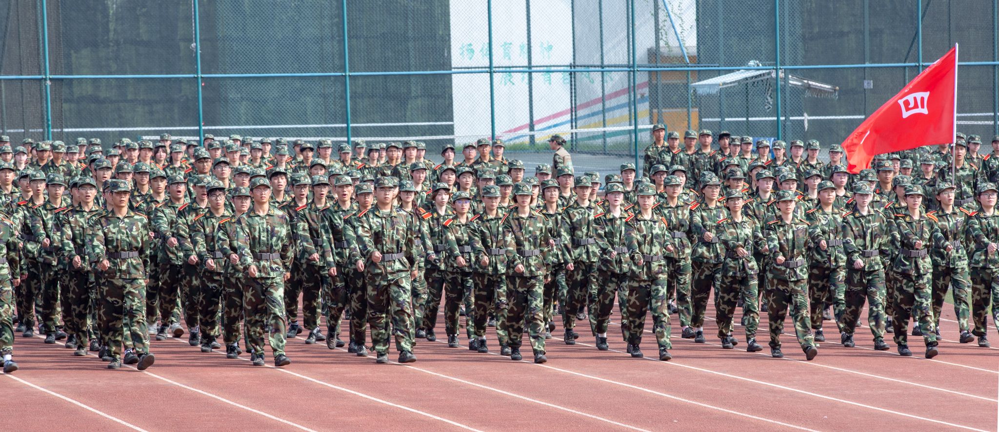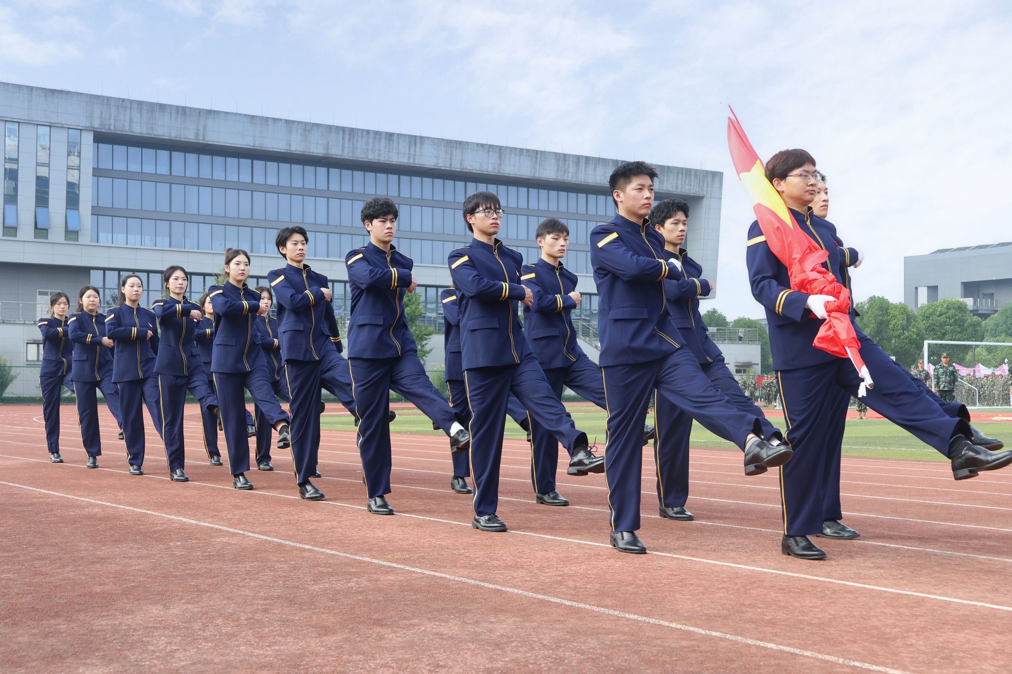 伴随着庄严的升国旗、奏唱国歌仪式,2025级学生军训总结大会拉开帷幕。在激昂的《分列式进行曲》中,护旗方队迈着正步昂首前行,校旗、团旗和80面鲜红的旗帜在晨光中猎猎飘扬。