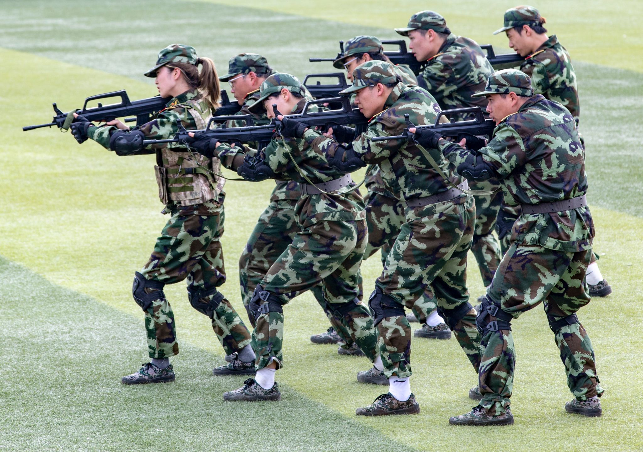 分列式结束后,特色汇报表演刺杀方阵、战术方阵、匕首操、警卫拳、擒敌拳等迅速将现场气氛推向高潮。全场齐唱军歌时,激昂的旋律凝聚起浓浓的家国情怀。