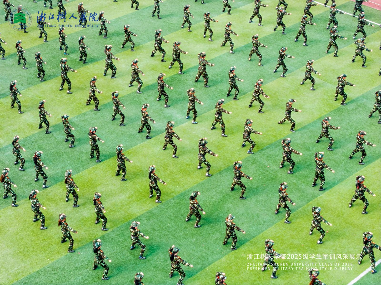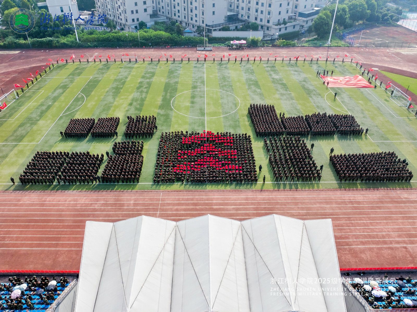 值得一提的是数字表演方阵,新生们通过精准的队列变换,先后组成 “1945”“2025”“1984” 等数字和“铭记历史、缅怀先烈,珍爱和平、开创未来”“崇德重智、树人为本,我爱树人“等文字,以创意十足的形式回望历史、表白树人,让青春担当在方阵变换中落地生根。